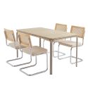 Les chaises ELLA apportent une touche de charme vintage grâce à leur dossier en cannage circulaire, inspiré du design rétro. Leurs pieds en métal chromé viennent moderniser l’ensemble avec une finition élégante et contemporaine. Le velours côtelé écru renforce l’aspect chaleureux et tendance de la composition.