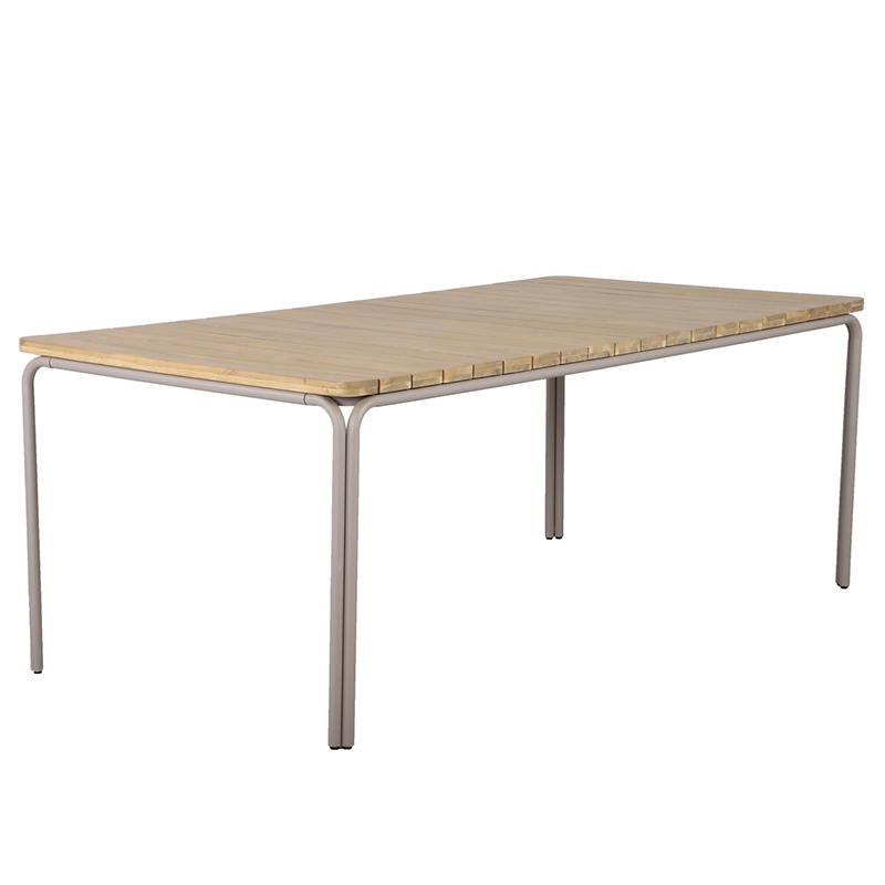 La table ASTI séduit par son alliance harmonieuse entre bois d’acacia certifié FSC et structure en acier beige. Ce mix matière apporte un équilibre parfait entre authenticité et modernité. Sa forme rectangulaire permet d’accueillir jusqu’à 6 convives, idéale pour partager des repas en famille ou entre amis, en intérieur comme en véranda.