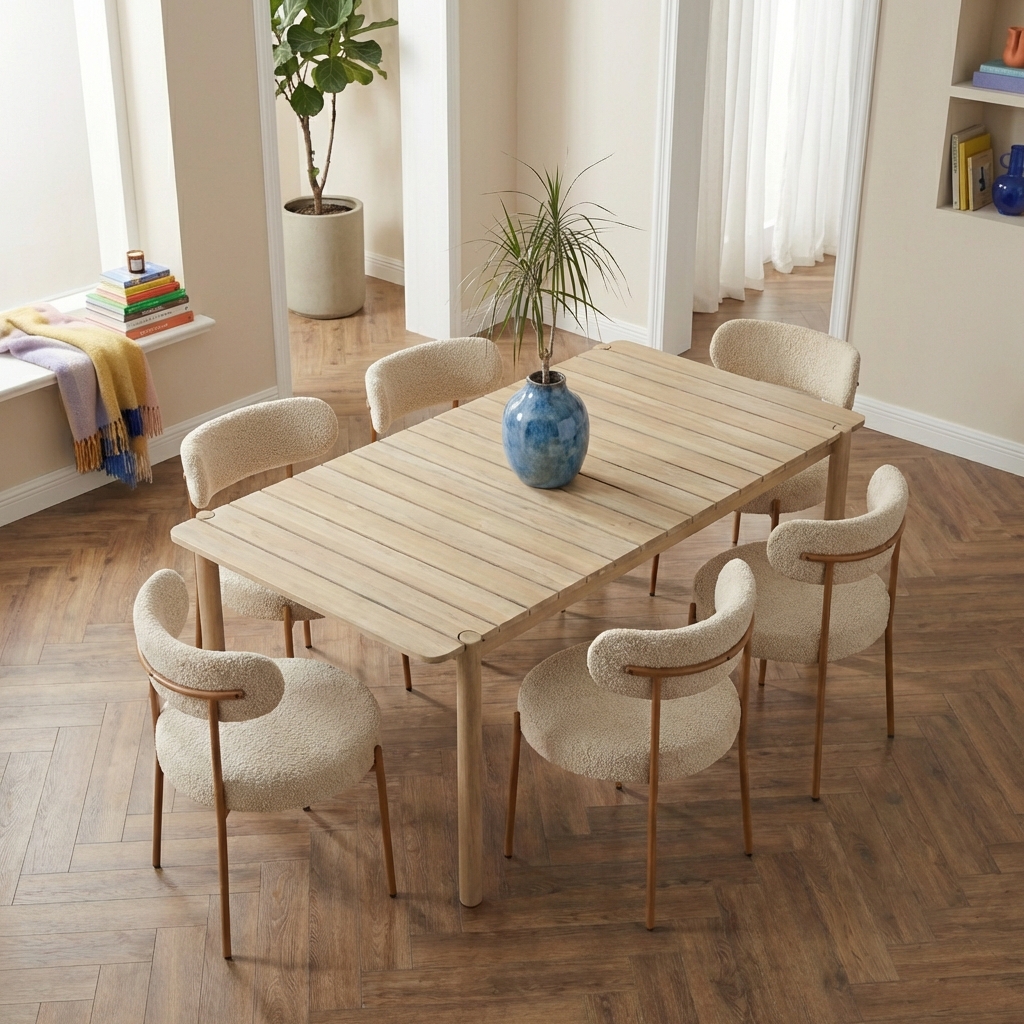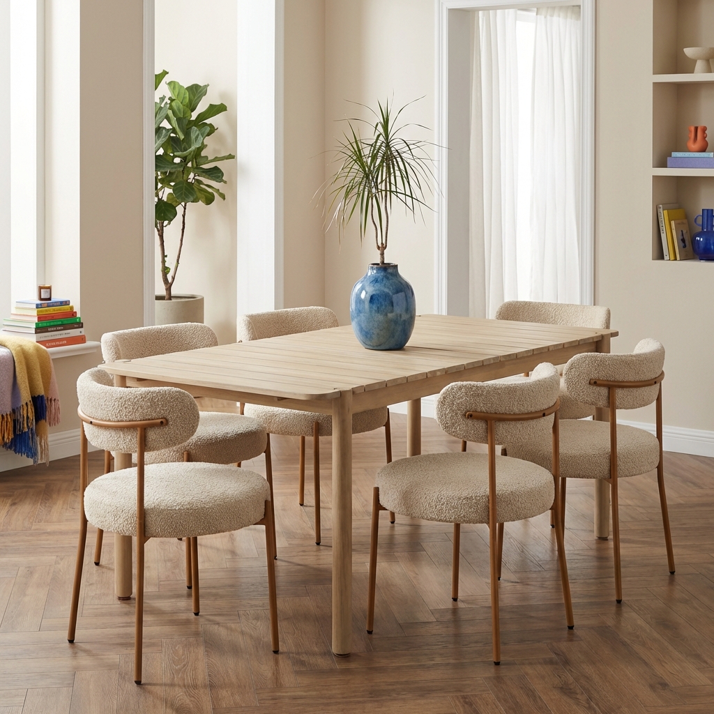 Apportez du style et de la convivialité à votre intérieur avec l’ensemble repas composé de la table SAMOA 180 cm et de 6 chaises NOA en tissu bouclette.