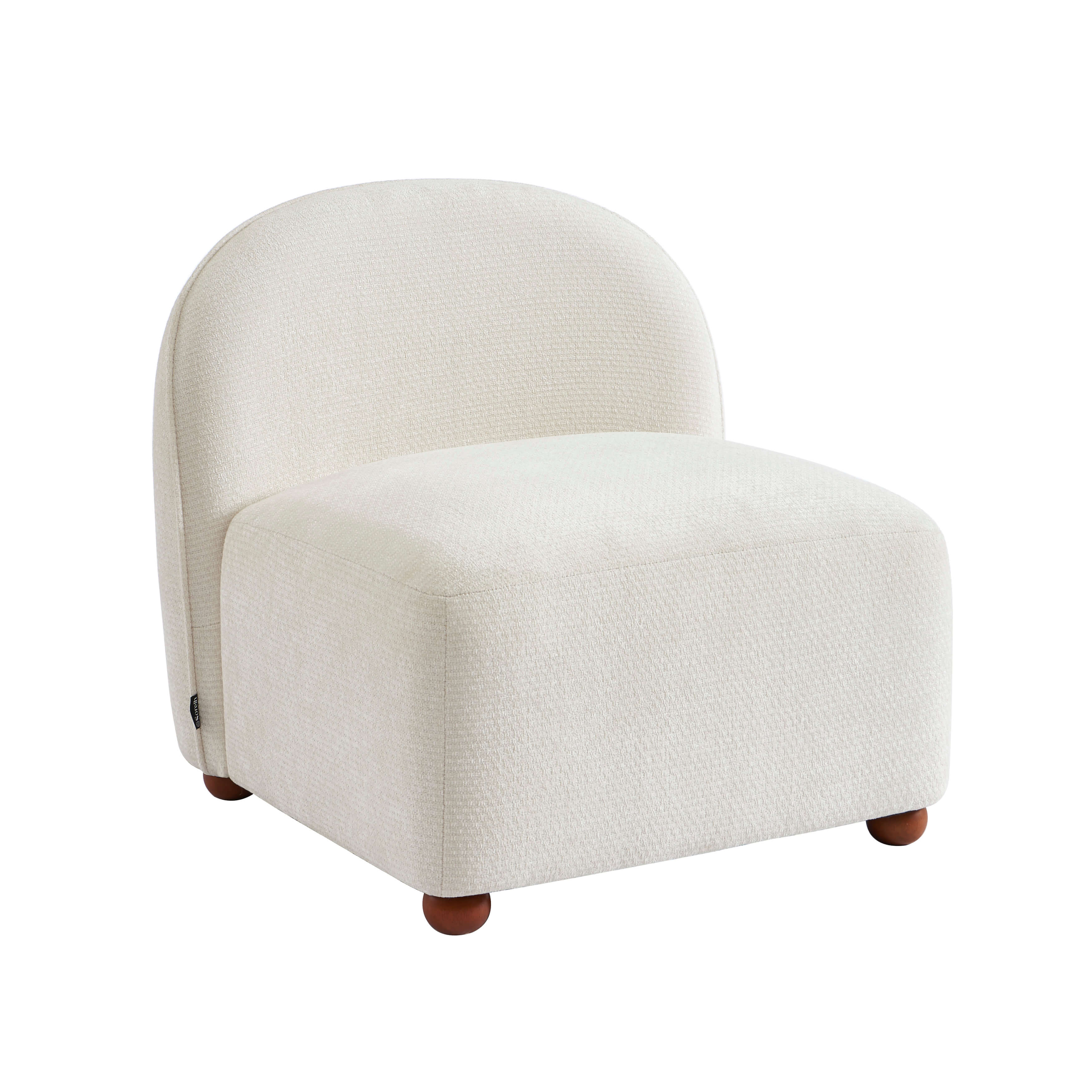 Le fauteuil JUDY en tissu chenille écru combine confort et élégance grâce à son revêtement doux et ses pieds boules en bois teintés noyer.