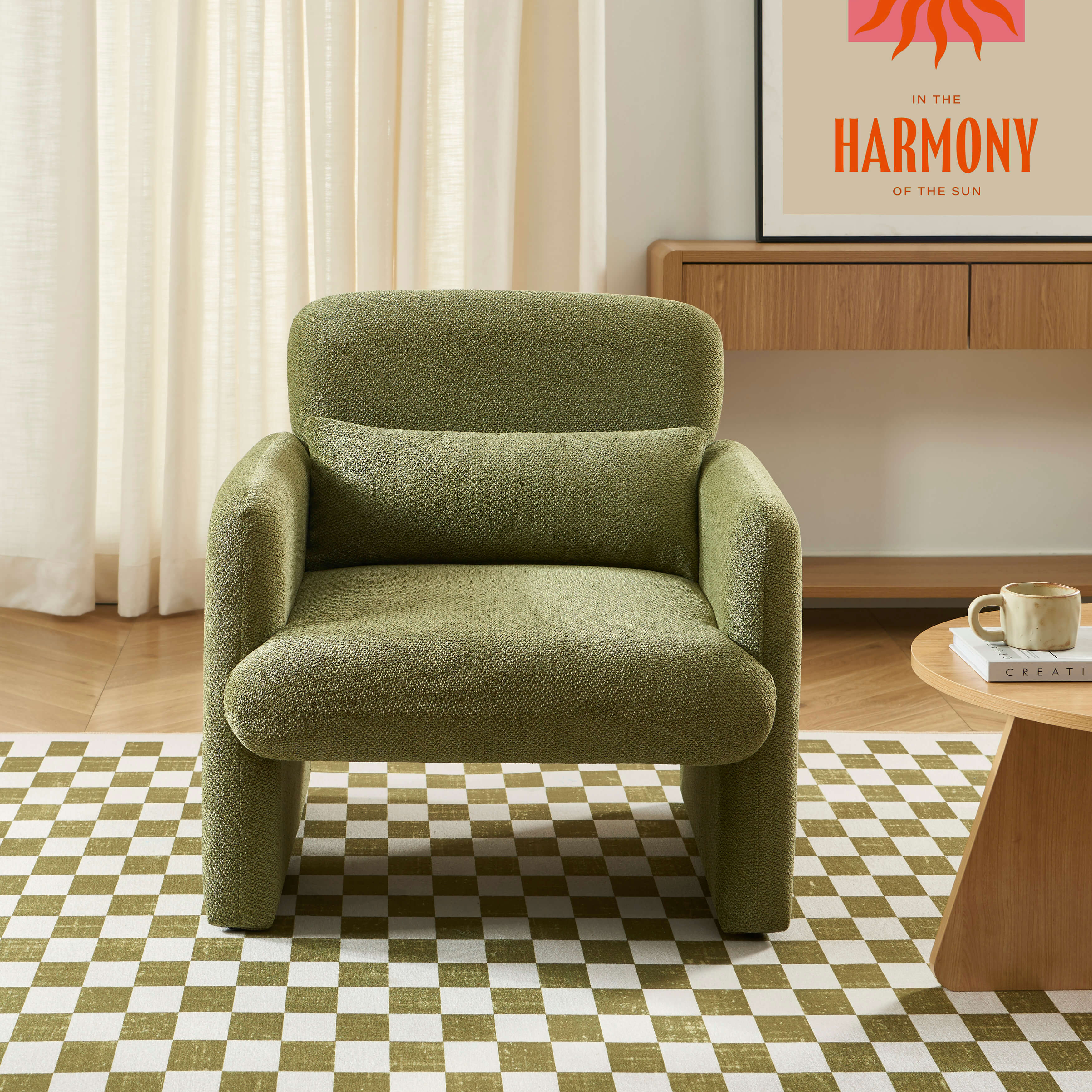 Avec ses formes arrondies et son revêtement en tissu doux, le fauteuil OMA invite à la détente.