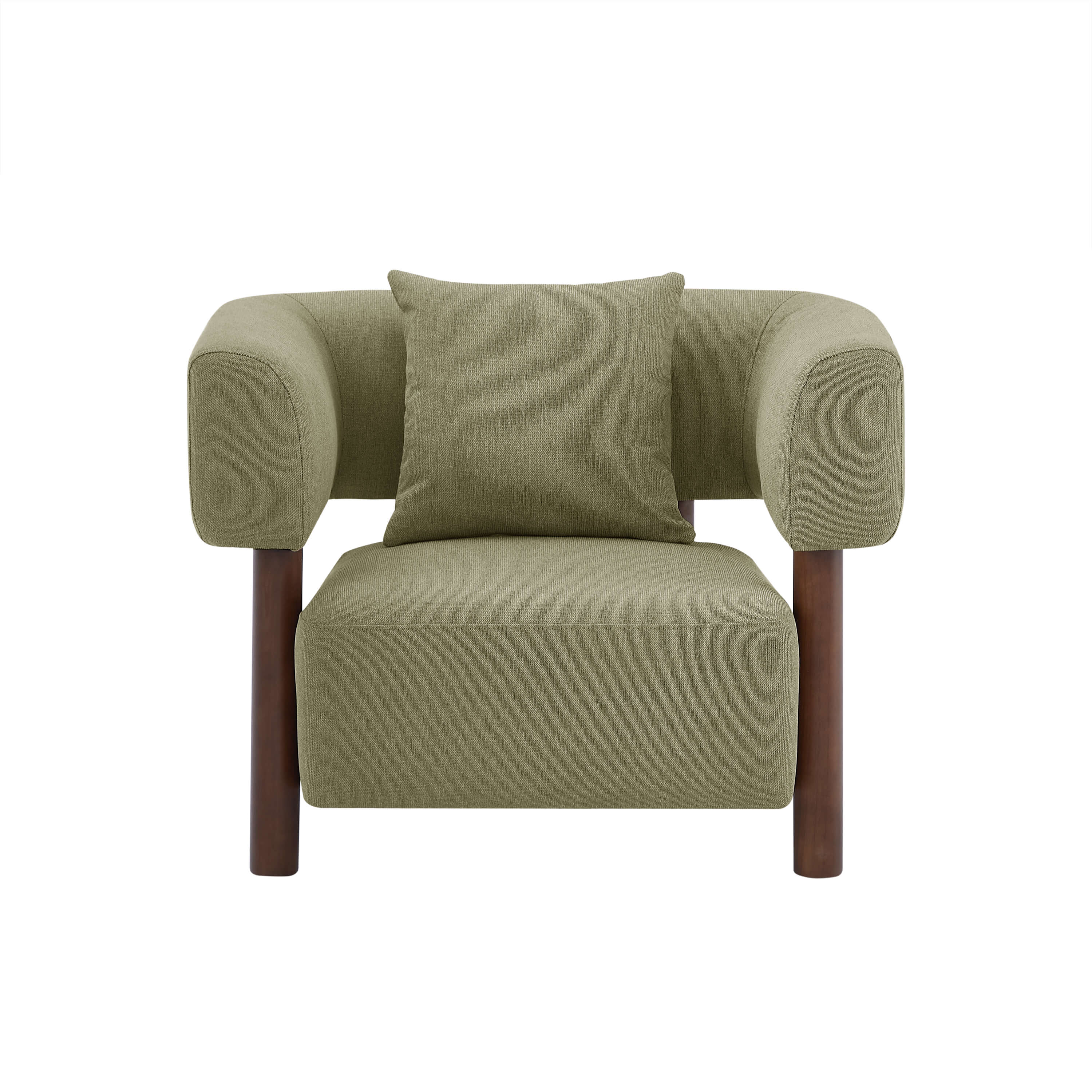 équilibréLe fauteuil BRAZZA combine design moderne et compact avec un tissu élégant. Ses pieds en bois et son coussin décoratif apporteront confort et style à votre pièce.