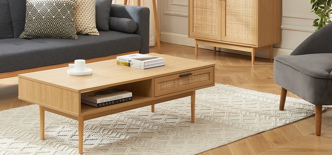 La table basse en cannage : pour une touche de cannage plus discrète, sur un tiroir ou un double plateau par exemple.