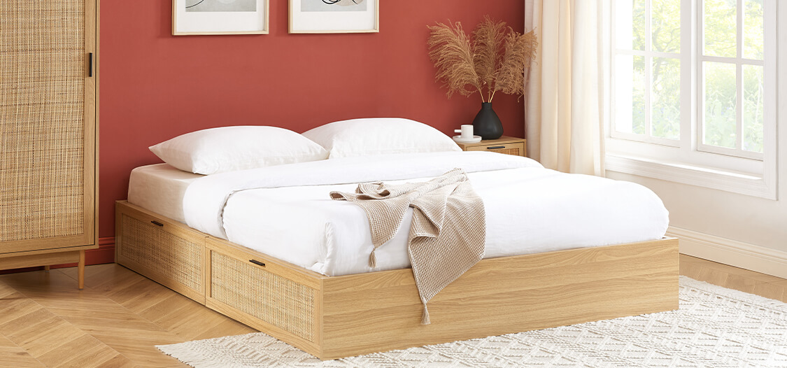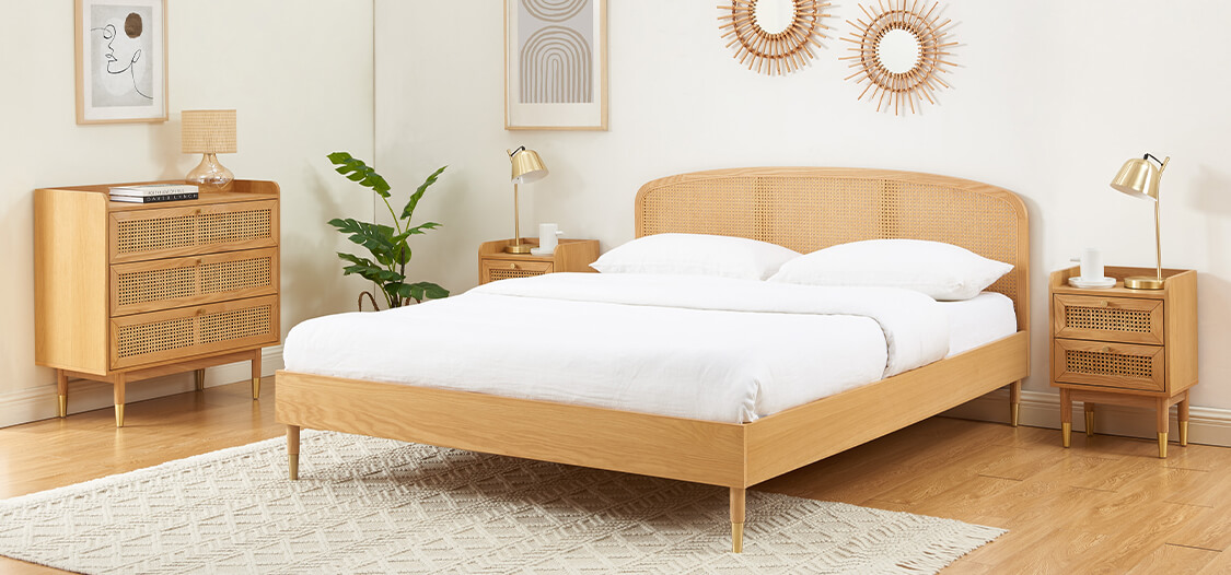 La chambre étant synonyme de confort et de bien-être, on aime lui apporter des matériaux naturels et chaleureux, tel que le cannage. Ainsi, pour une atmosphère invitant à la détente, on accordera le cannage avec des tons chauds comme du terracotta, du beige ou encore du jaune ocre, ainsi que d’autres matières comme du tissu, du lin, du velours ou encore quelques éléments déco en rotin.
