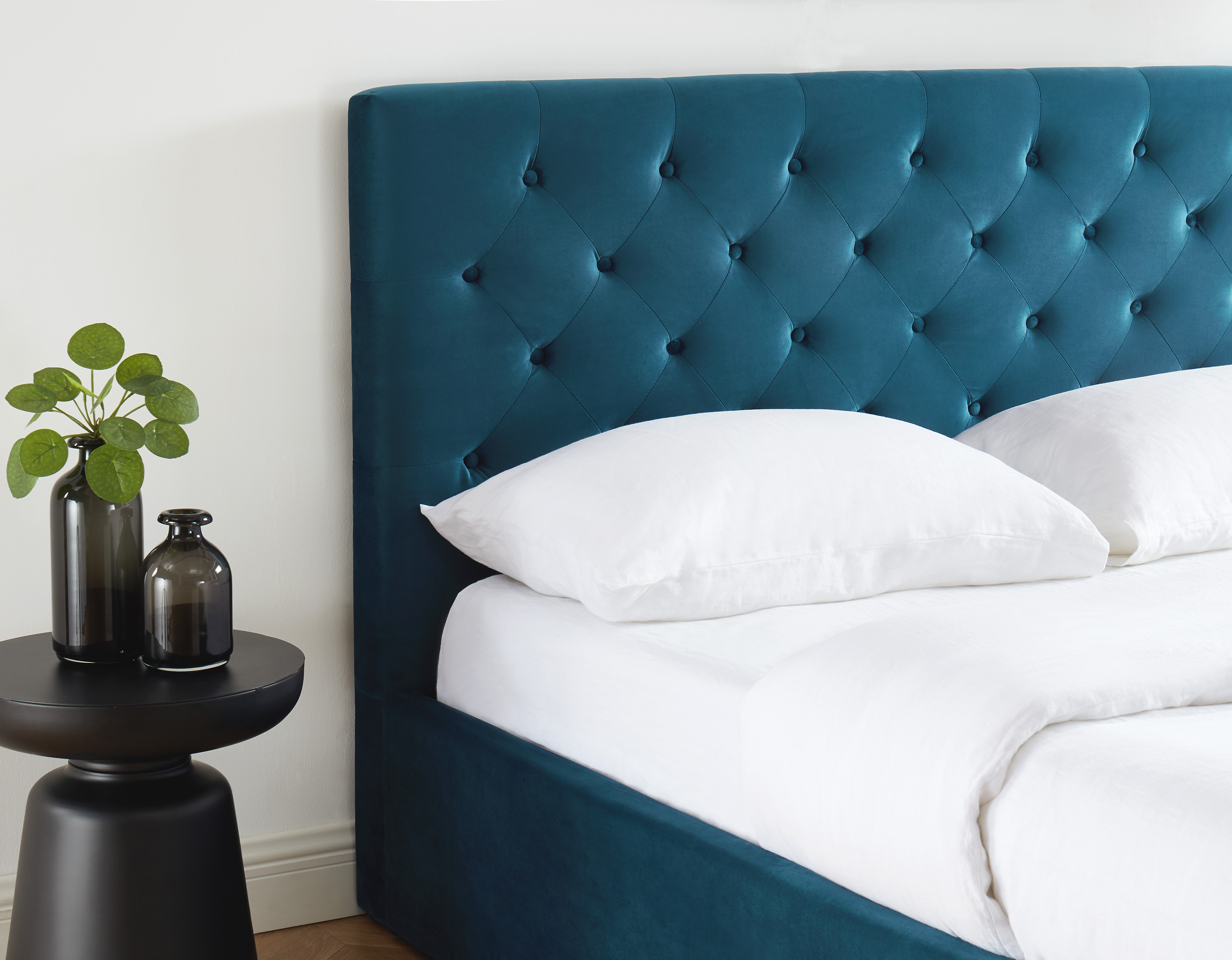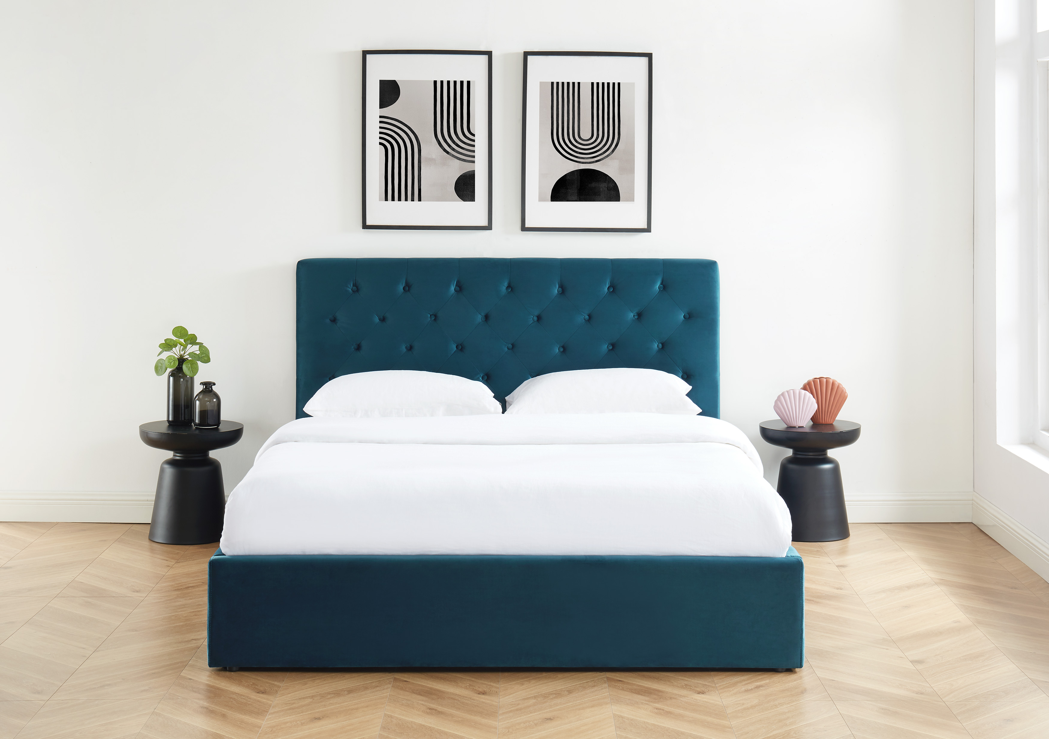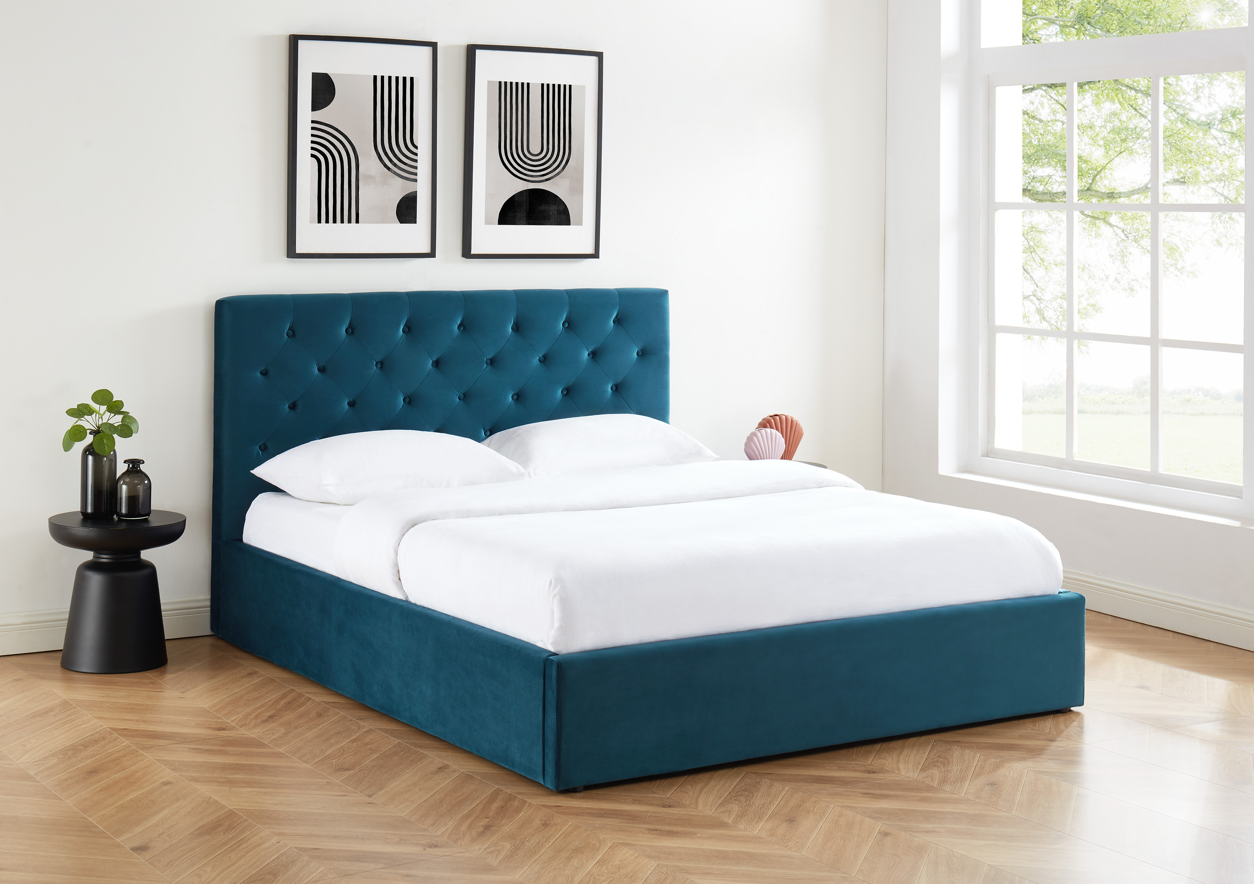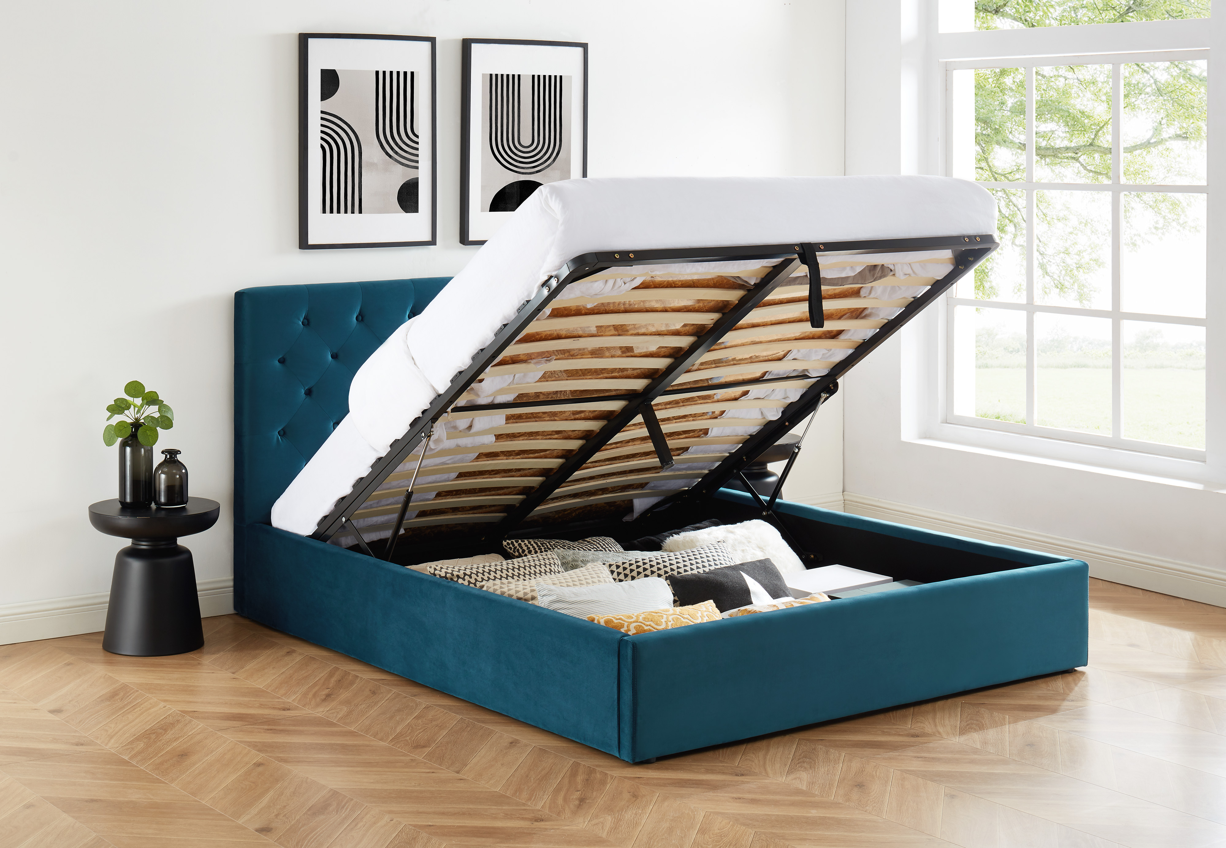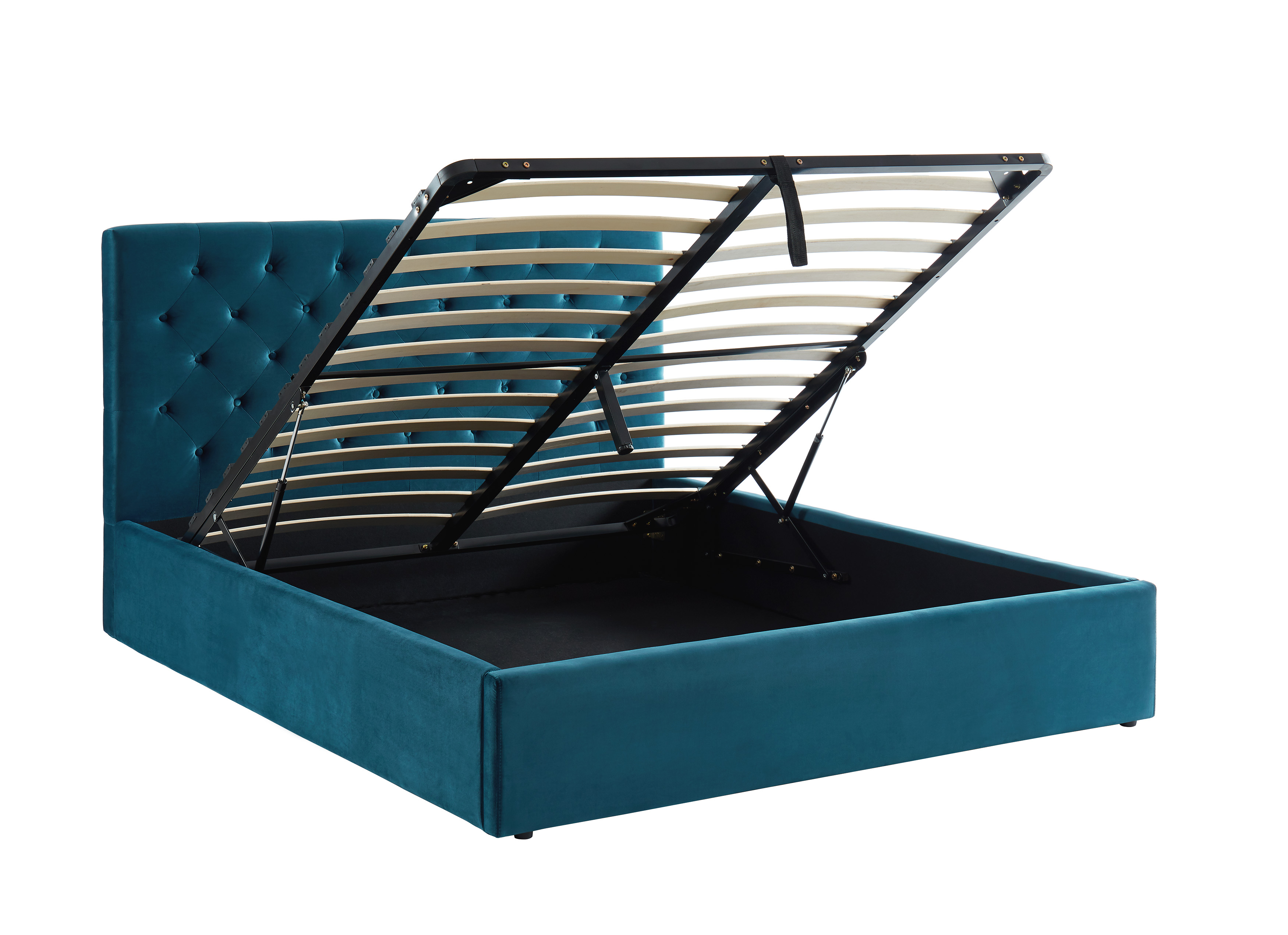 De style vintage, le lit HUBERT vous propose un confort sans pareil avec sa tête de lit capitonnée. Osez la couleur avec Hubert, votre décoration sera des plus élégantes avec le velours bleu et les pieds en bois massifs de couleur noir ! Le gros point fort de ce lit : il vous offre un vaste espace de rangement avec son coffre sous le sommier relevable.