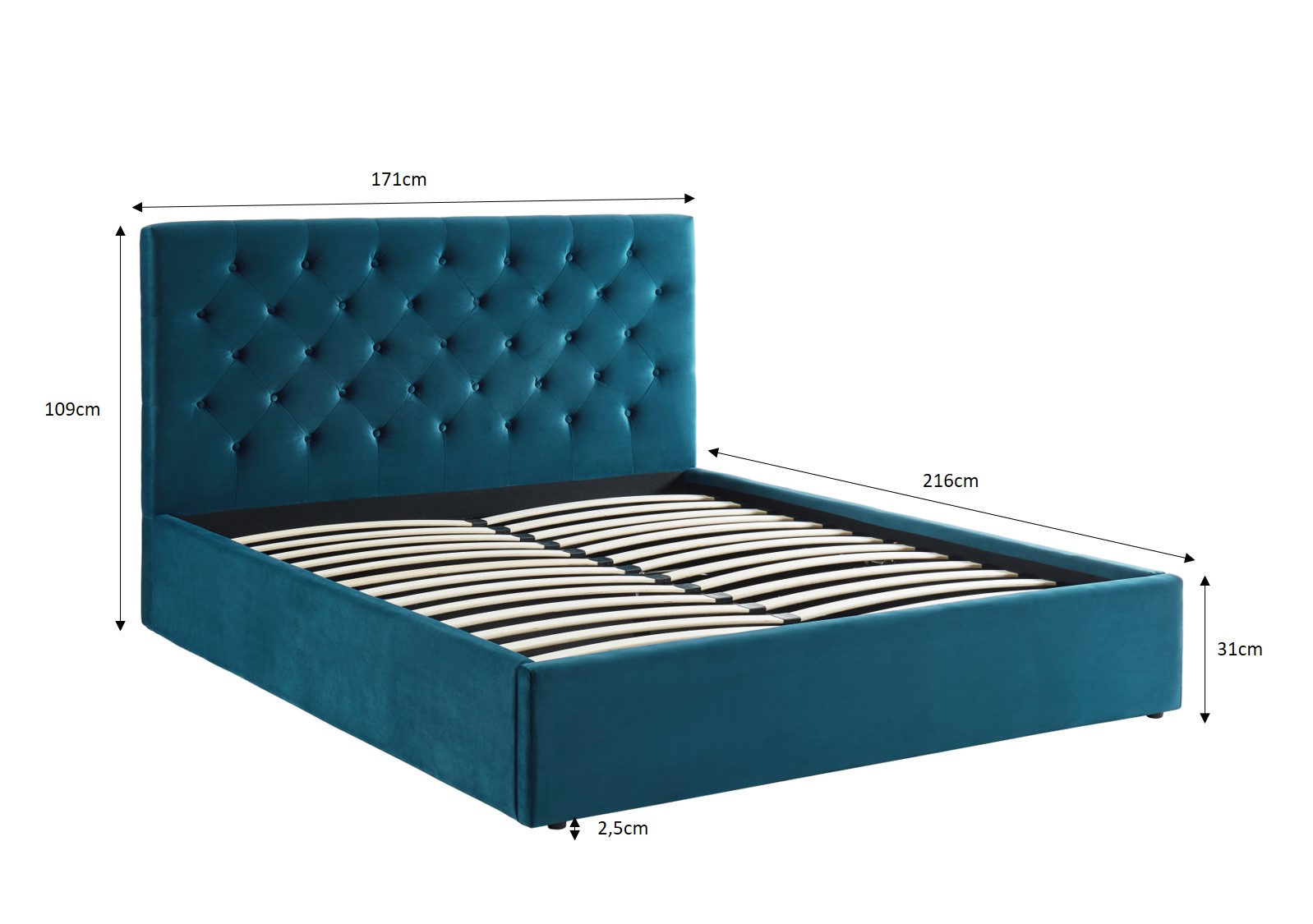 Lit double avec coffre HUBERT - Structure en bois et contreplaqué - Revêtement en velours bleu - Coffre de rangement sous le sommier à lattes 160x200cm inclus - Pieds en bois massif laqué noir H12 cm - Dimensions : L171 x P216 x H109cm.