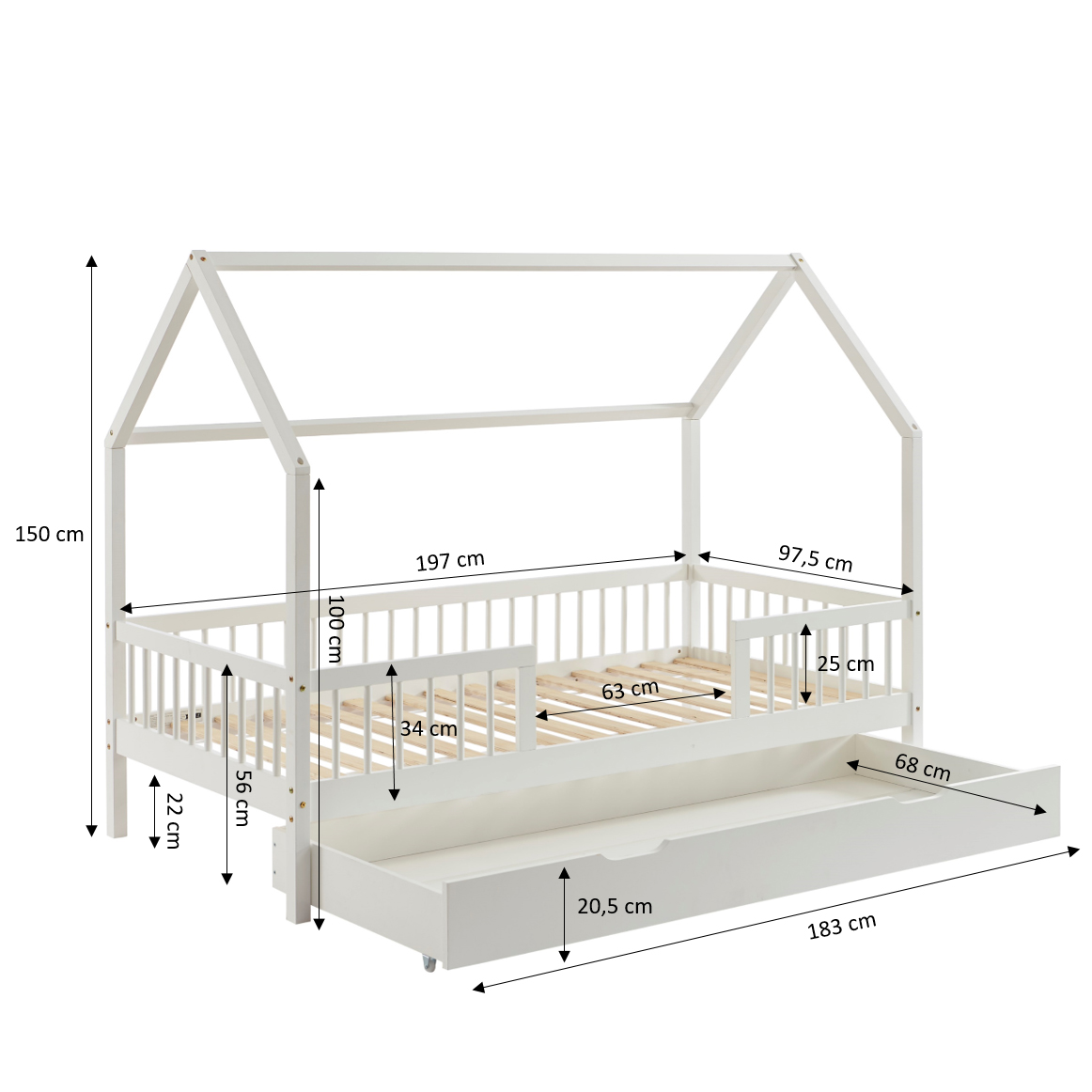 Lit cabane avec barrières TINY 90x190cm pin massif blanc sommier + tiroir inclus