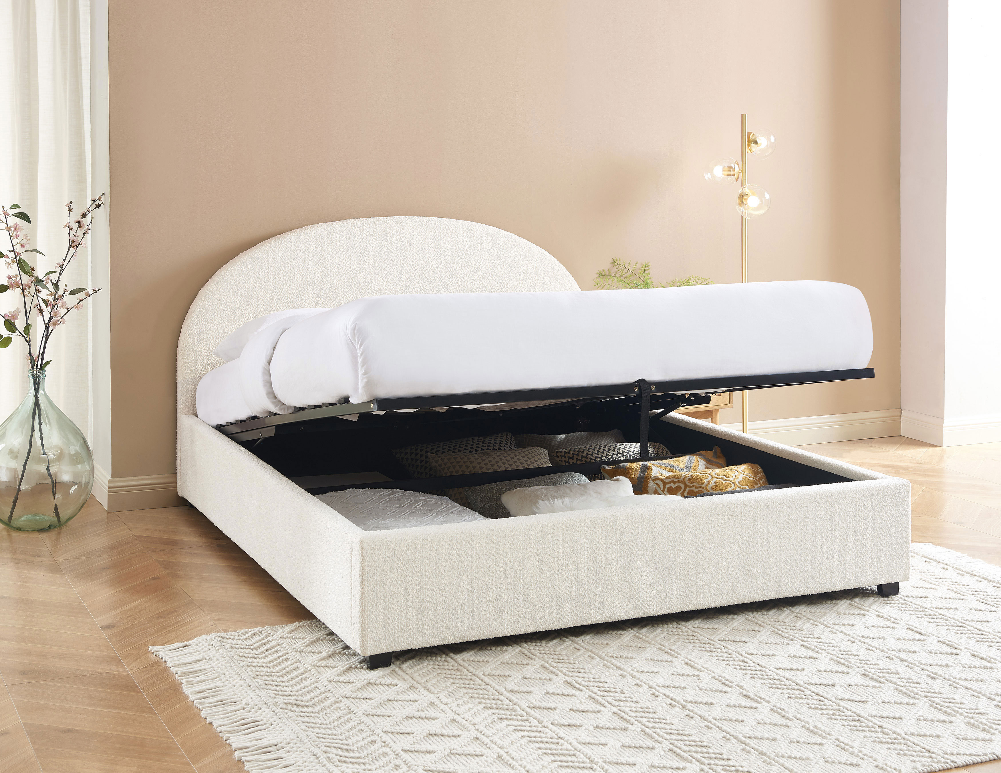 Laissez-vous tenter par ce magnifique lit coffre OLAF ! Avec sa tête de lit et son cadre en tissu bouclette, ce dernier ajoutera une vraie touche tendance à votre chambre à coucher. Son coloris écru, à la fois doux et simple, ira avec n'importe quel style de décoration et de meubles.