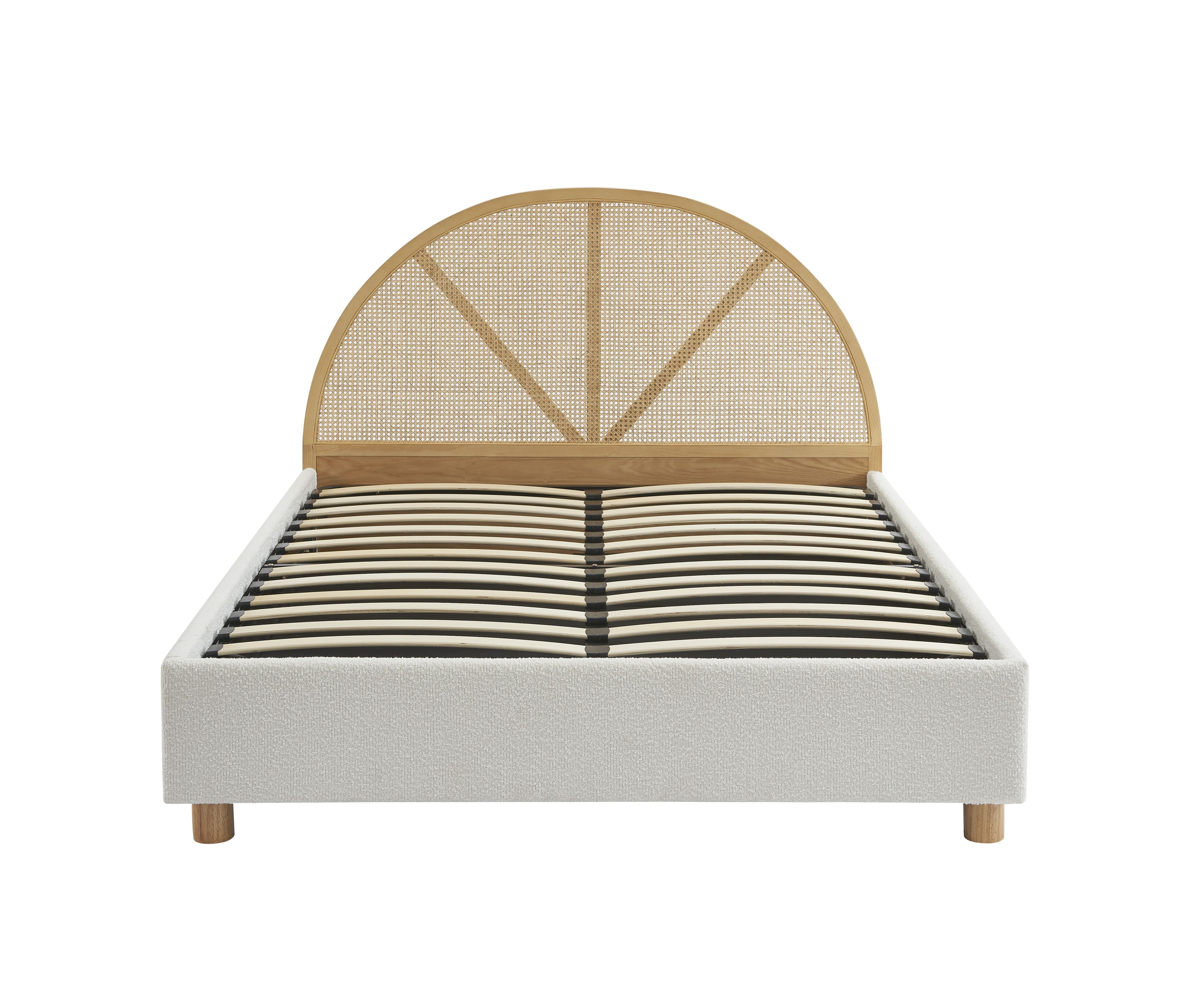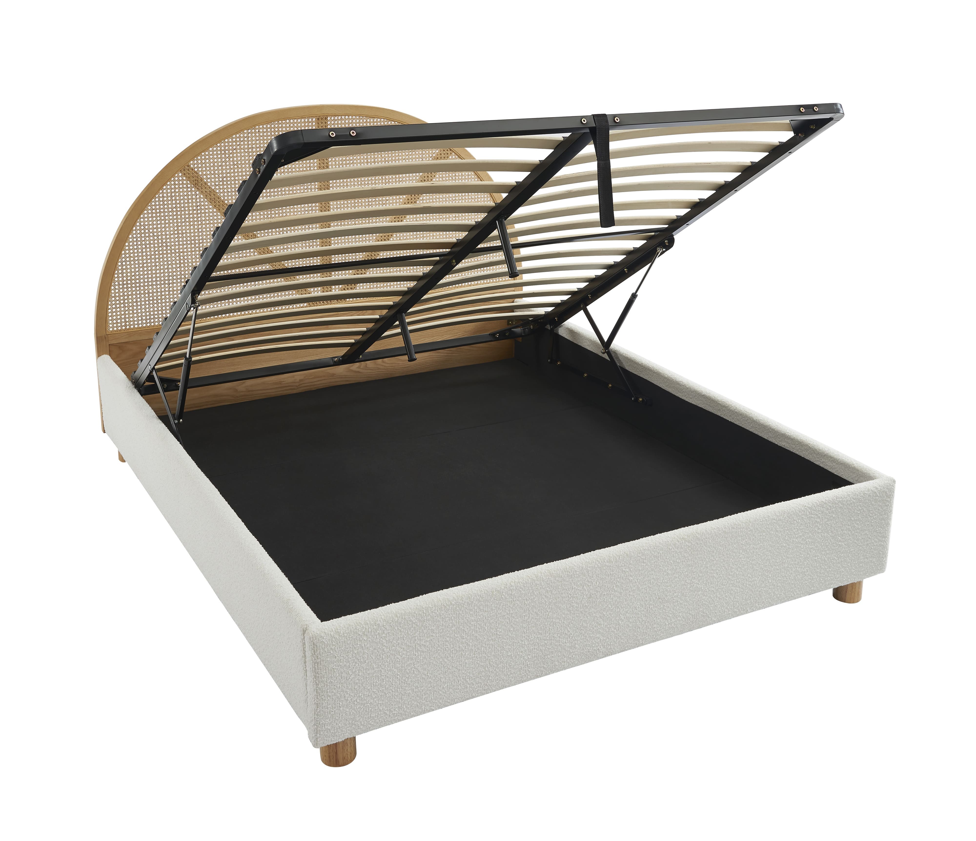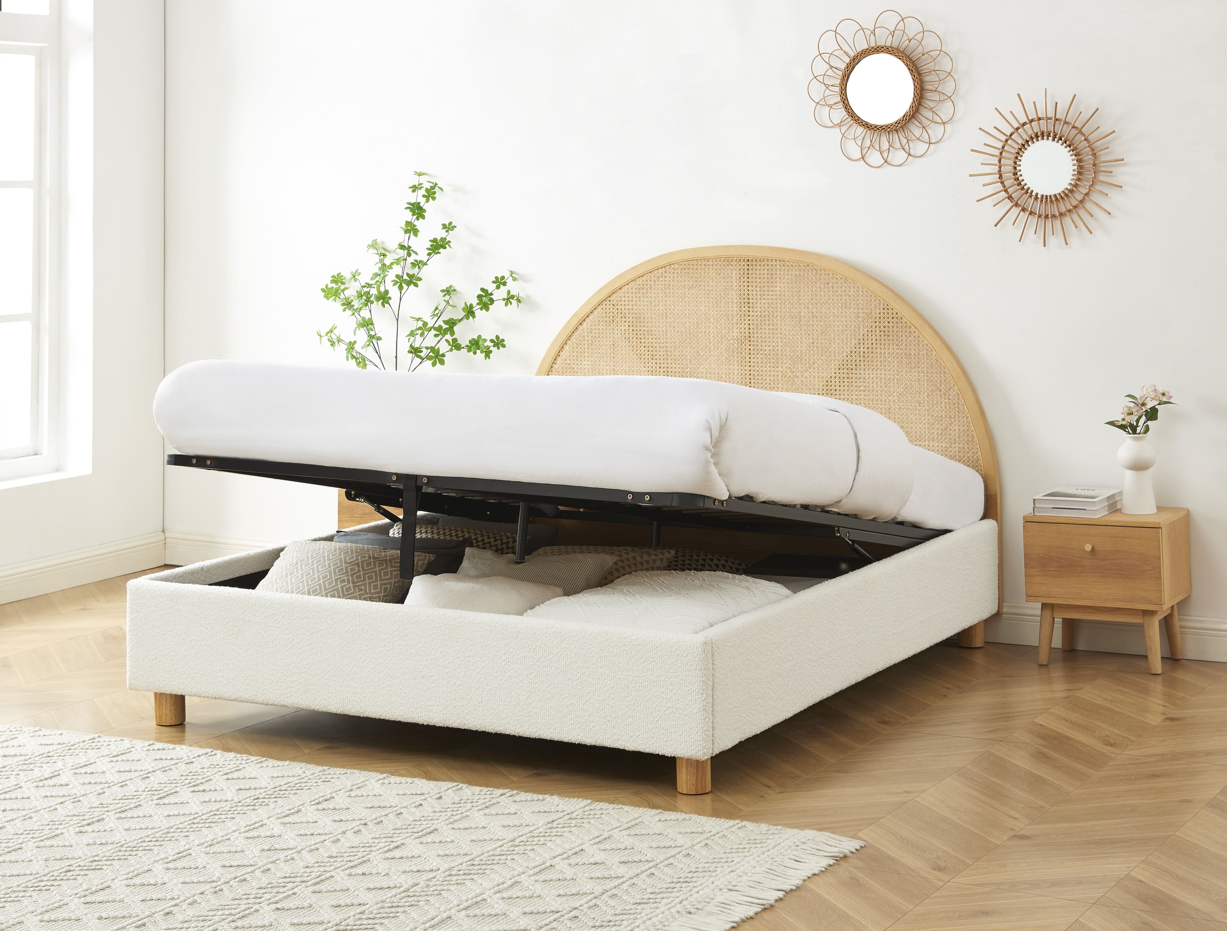 Pour votre chambre, optez pour le lit TSUKI. Alliant à la perfection le tissu bouclette et le cannage, TSUKI sera la pièce maitresse de votre chambre, ultra tendance. Son atout ? Son grand coffre de rangement situé sous le sommier, vous permettant de ranger couettes et oreillers en toute facilité.