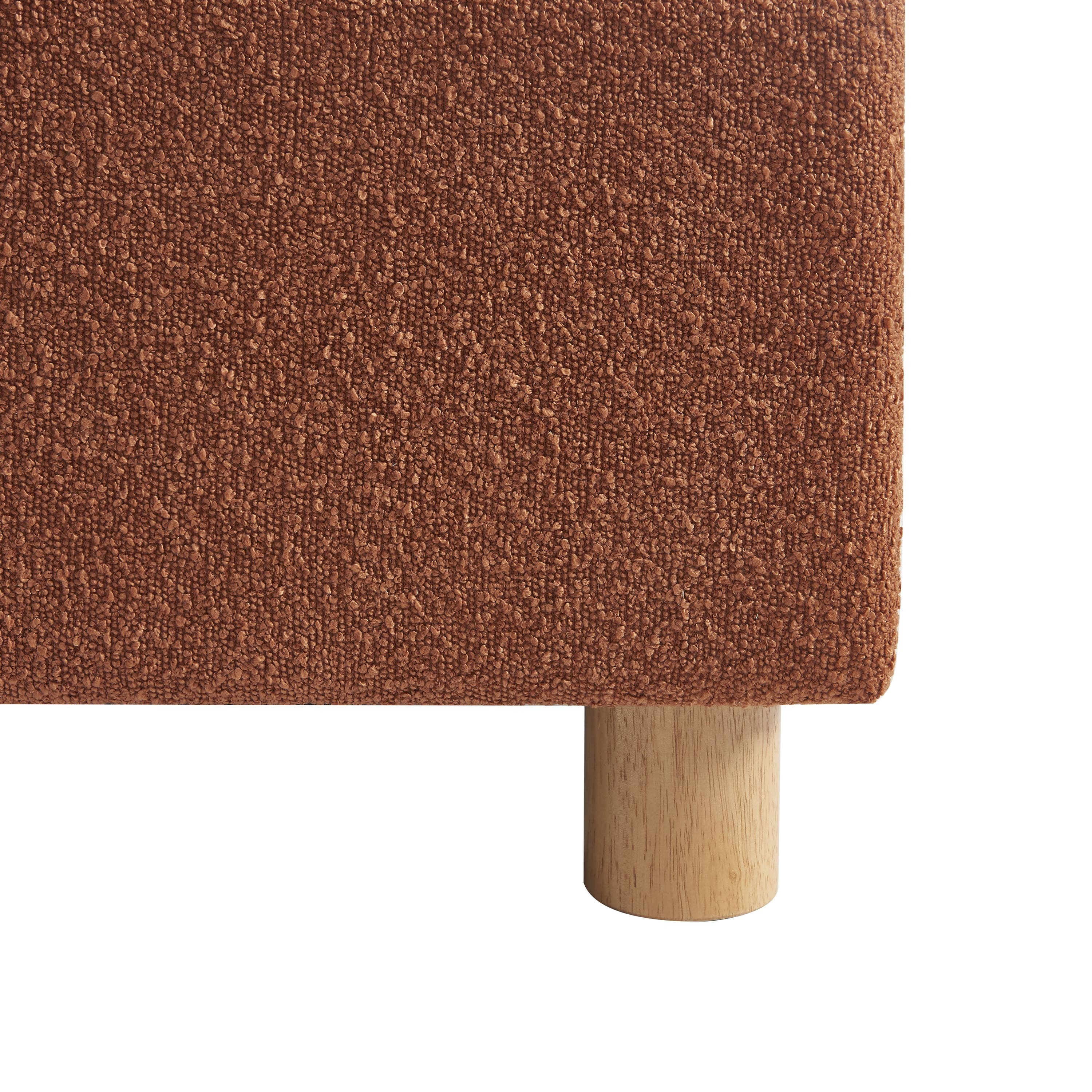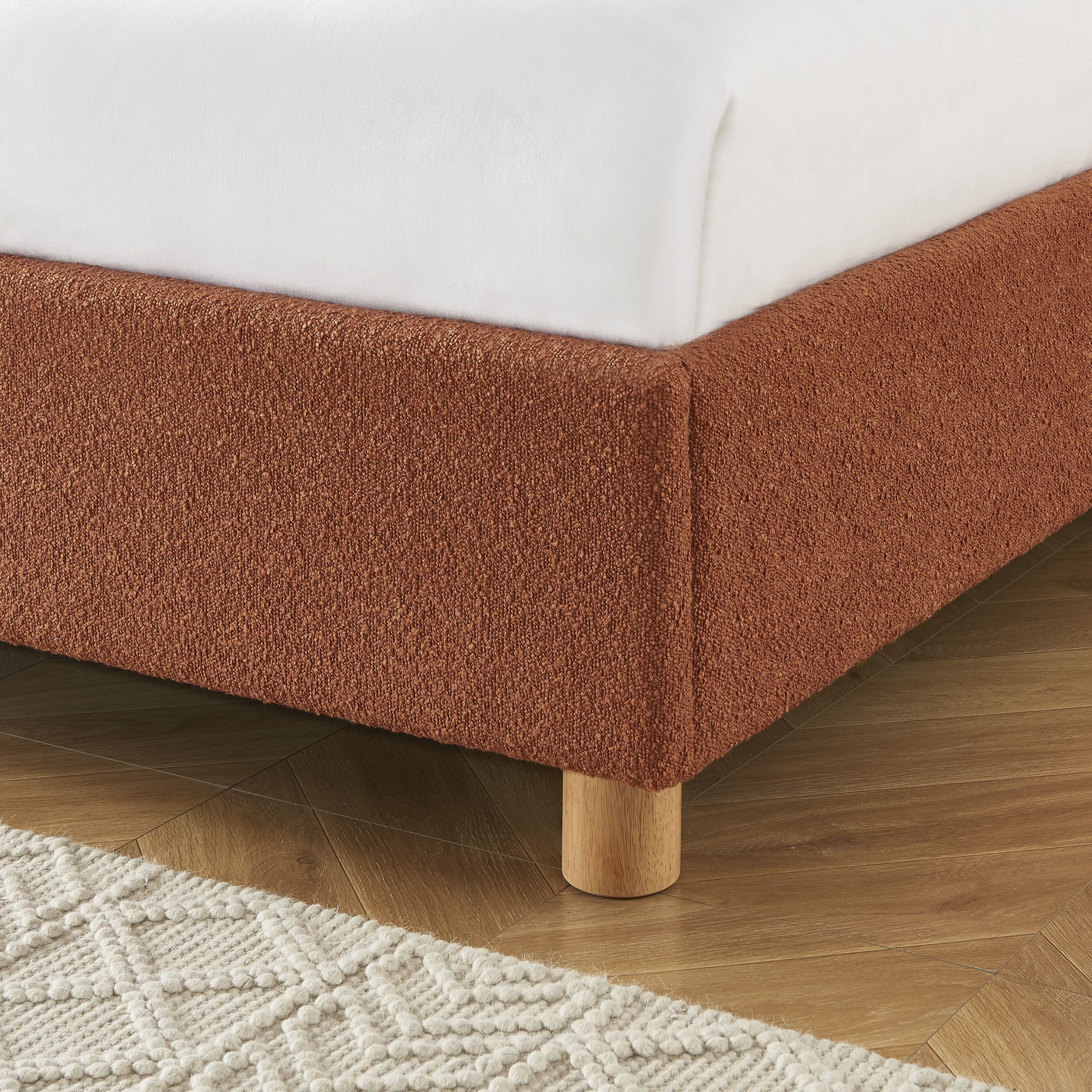 Les pieds du lit sont en bois d'hévéa massif, un matériau reconnu pour sa robustesse et sa durabilité. Ce bois, associé à la tête de lit en rotin et aux revêtements en laine bouclée ou en velours, renforce l'esthétique naturelle et élégante du lit TSUKI.