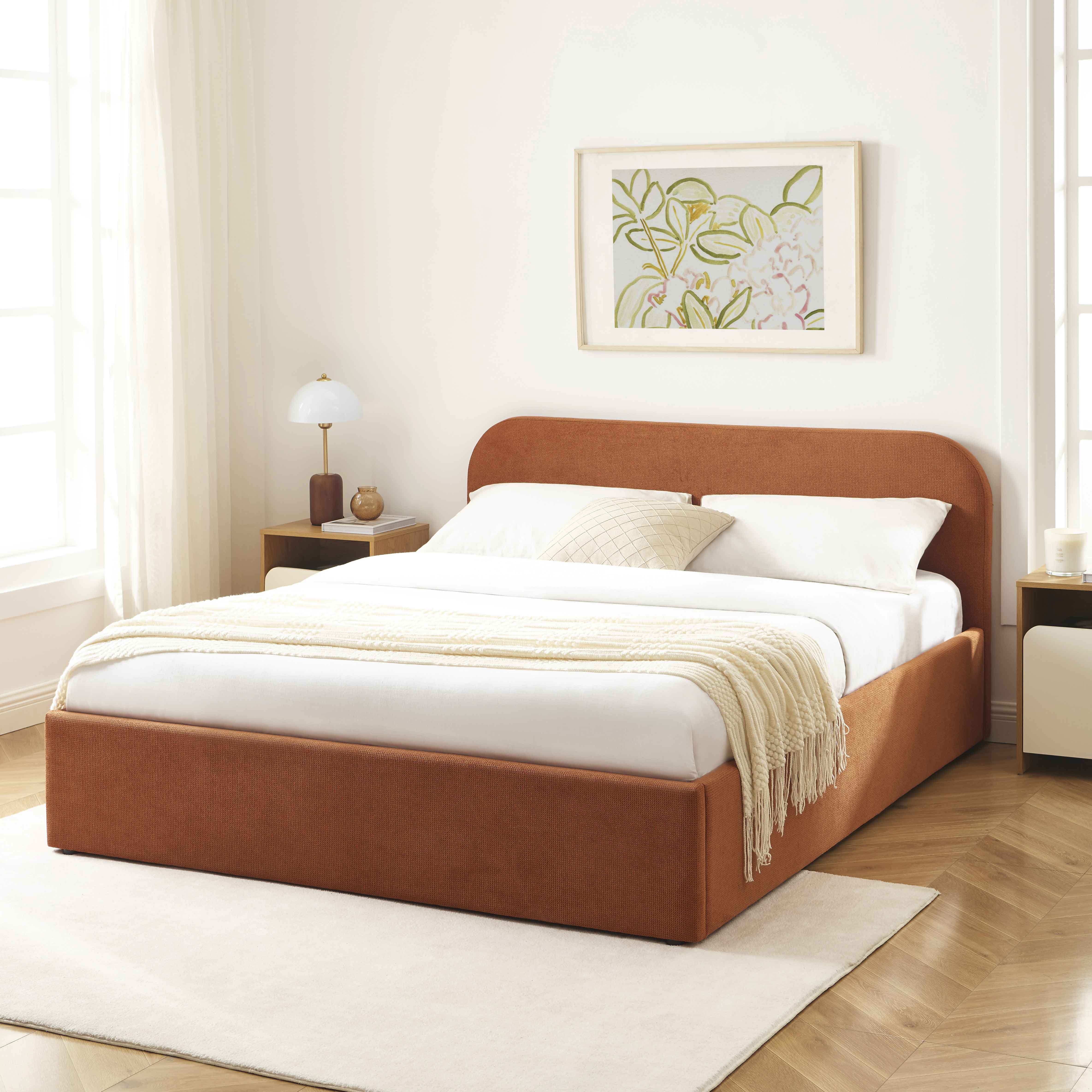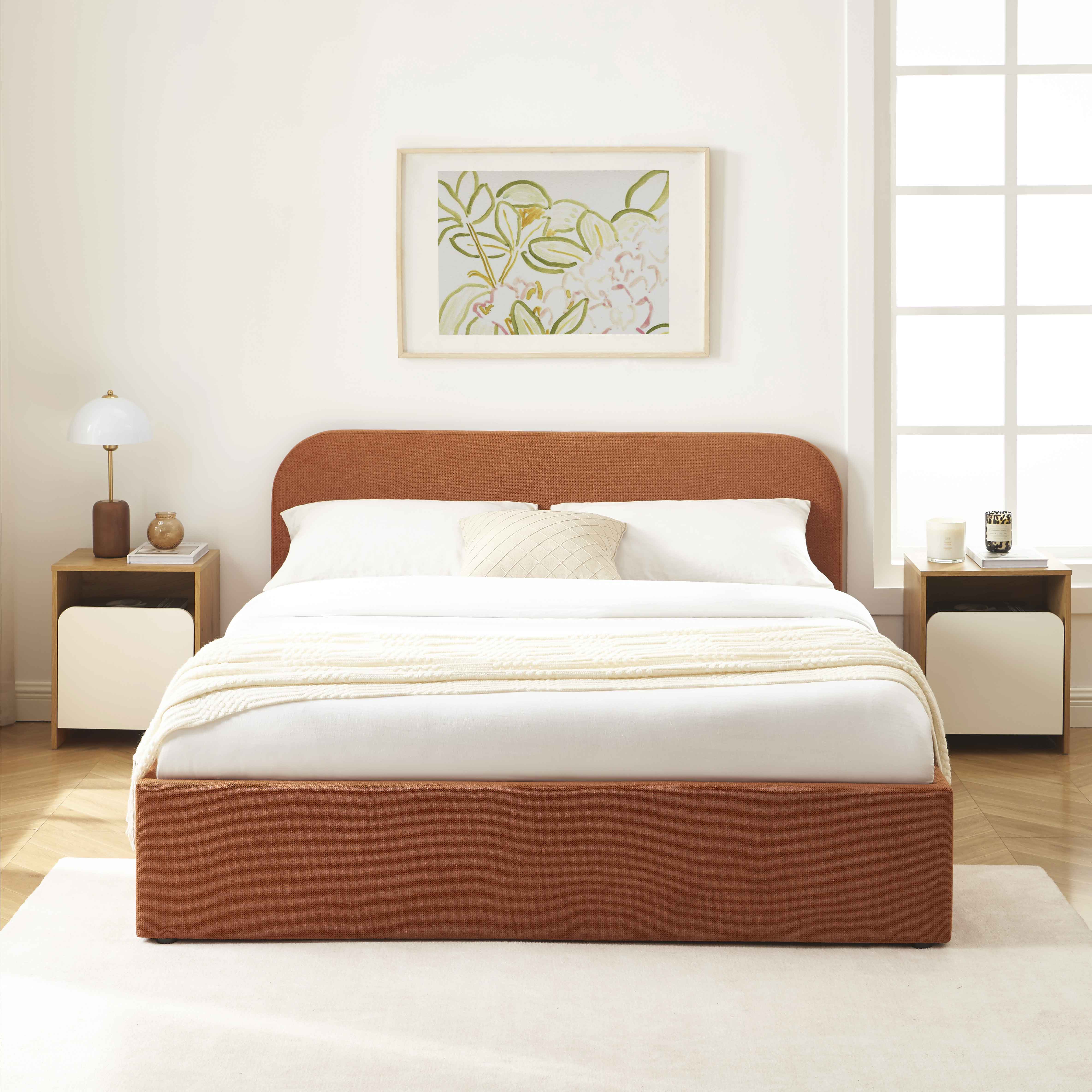 Le lit coffre MOKA allie esthétique et praticité avec son revêtement en tissu rouille tendance et son sommier relevable. Une solution astucieuse pour optimiser l'espace sans sacrifier le style.