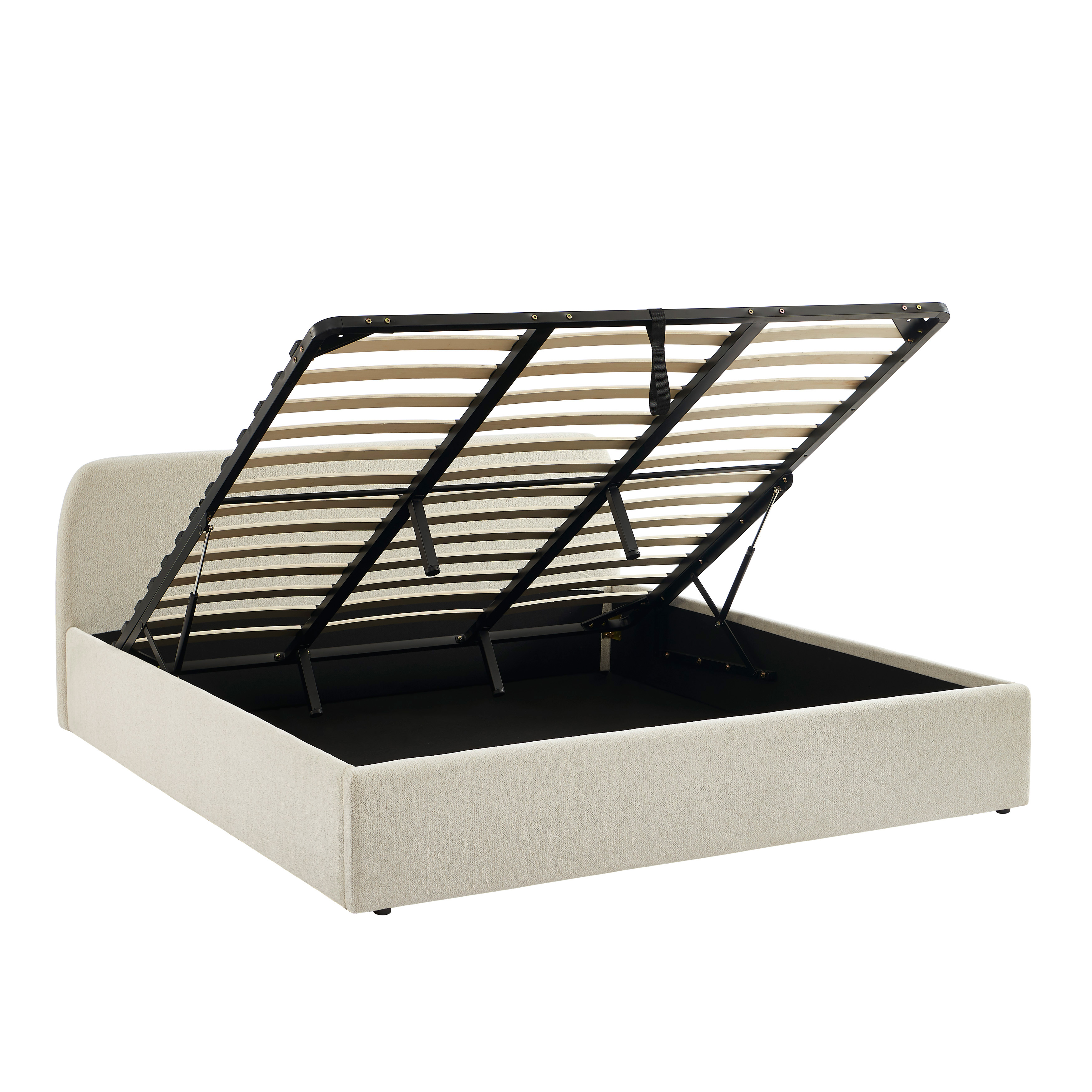 Profitez d'un coffre de rangement spacieux et pratique pour optimiser votre chambre. Grâce à son sommier relevable à lattes inclus et son fond en tissu, le lit GELA offre une solution idéale pour ranger vos couettes, oreillers ou tout autre objet du quotidien, tout en restant facilement accessible.