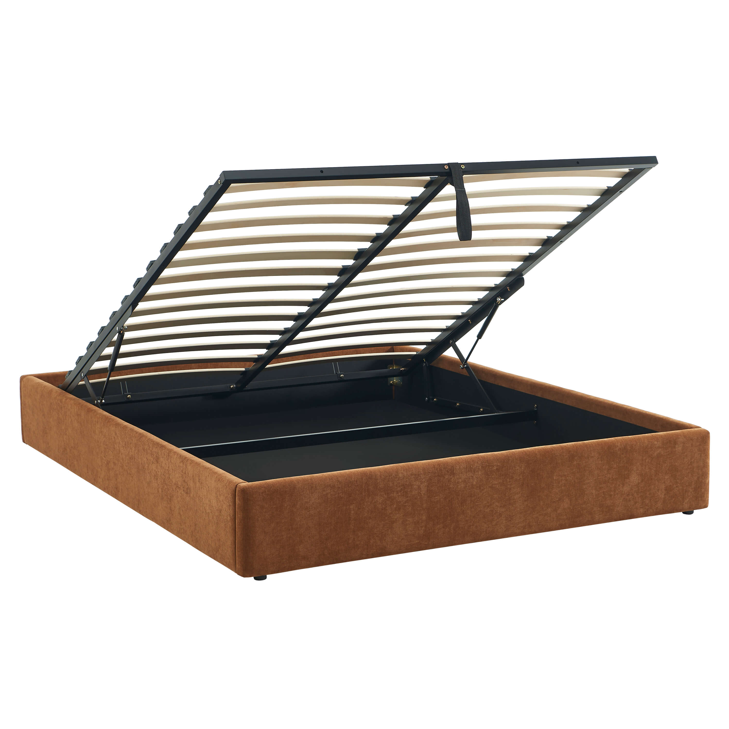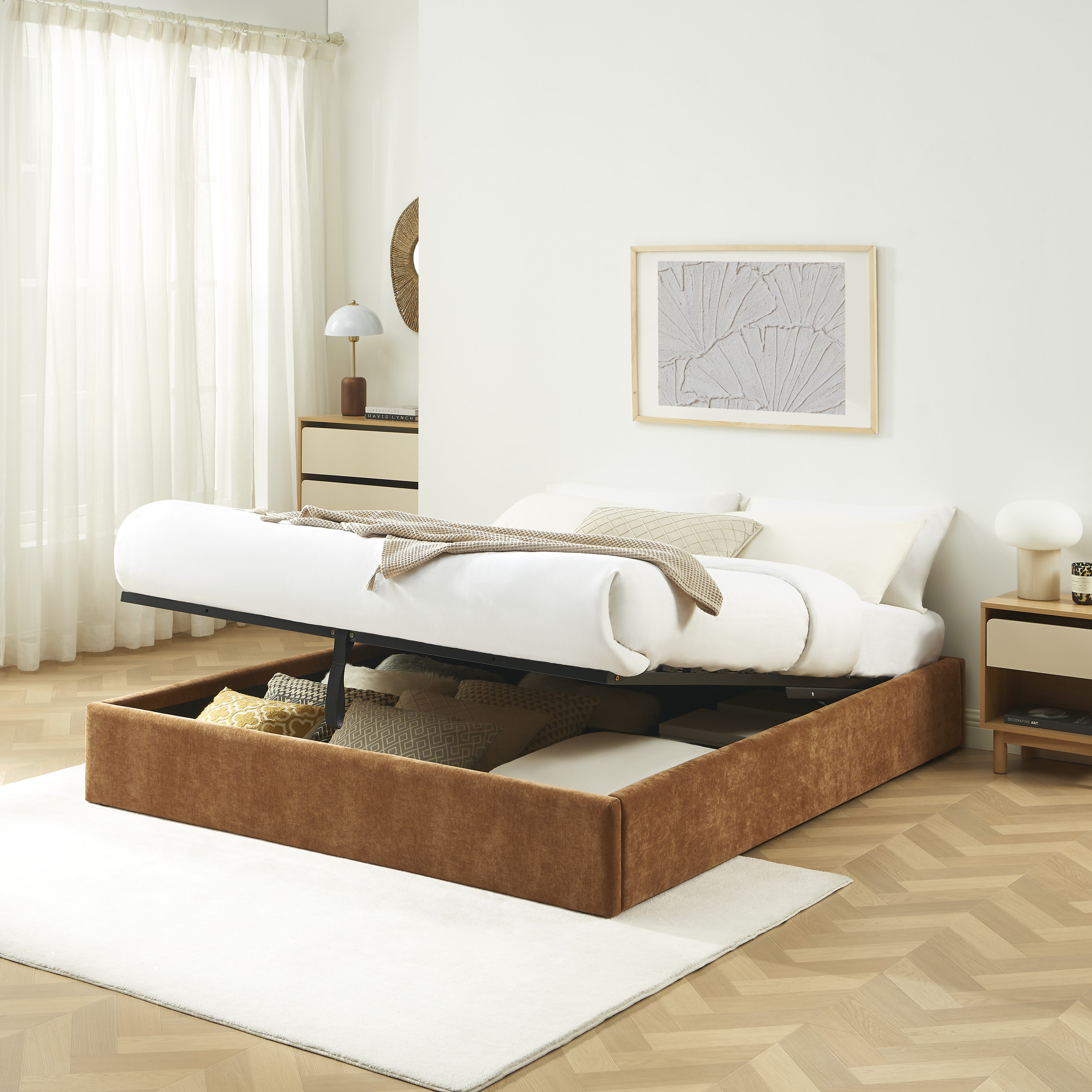 Ce lit dispose d'un coffre spacieux situé sous le sommier, parfait pour ranger couettes, oreillers ou linge de lit. Grâce à son sommier relevable, l'accès à l'espace de rangement est simple et rapide, sans efforts.