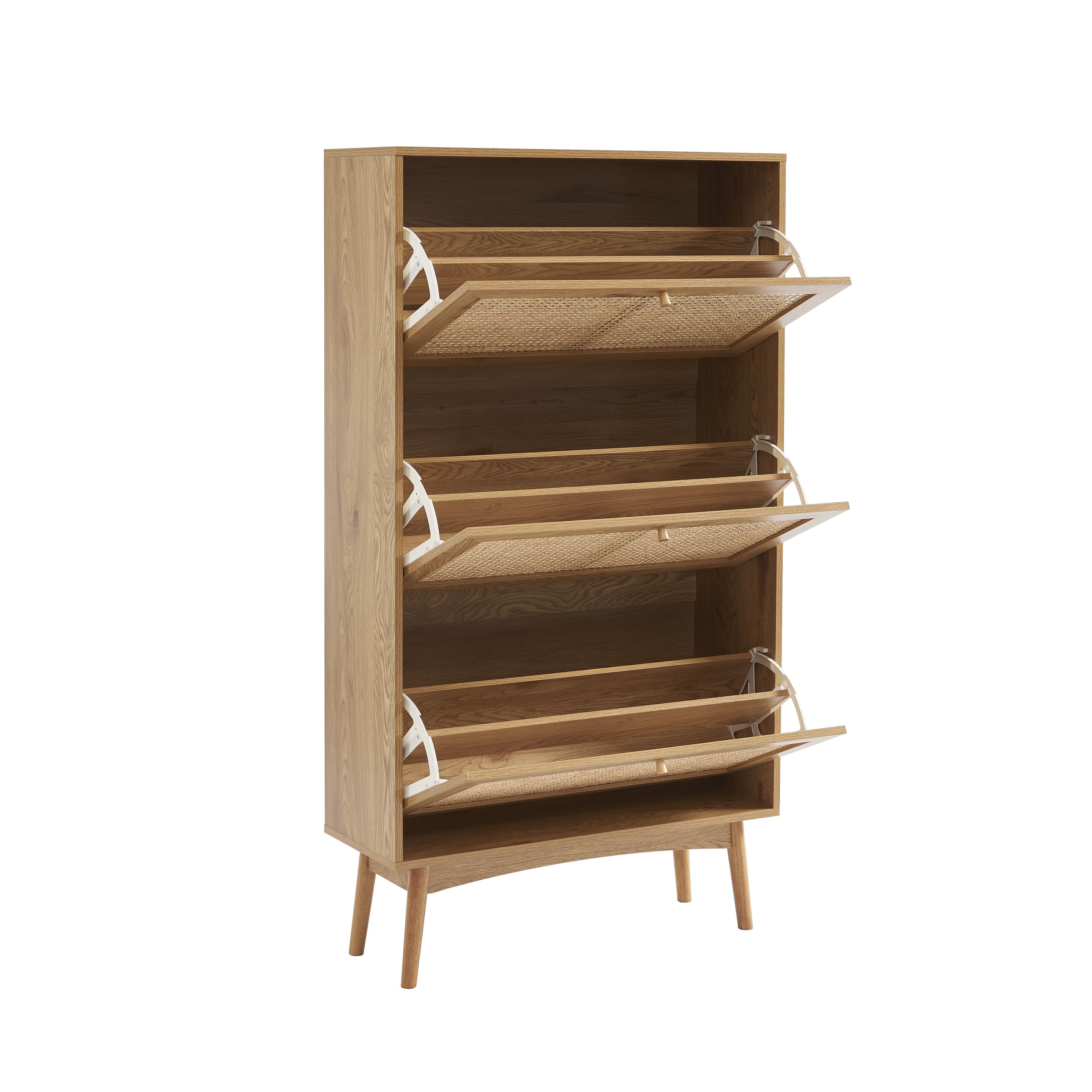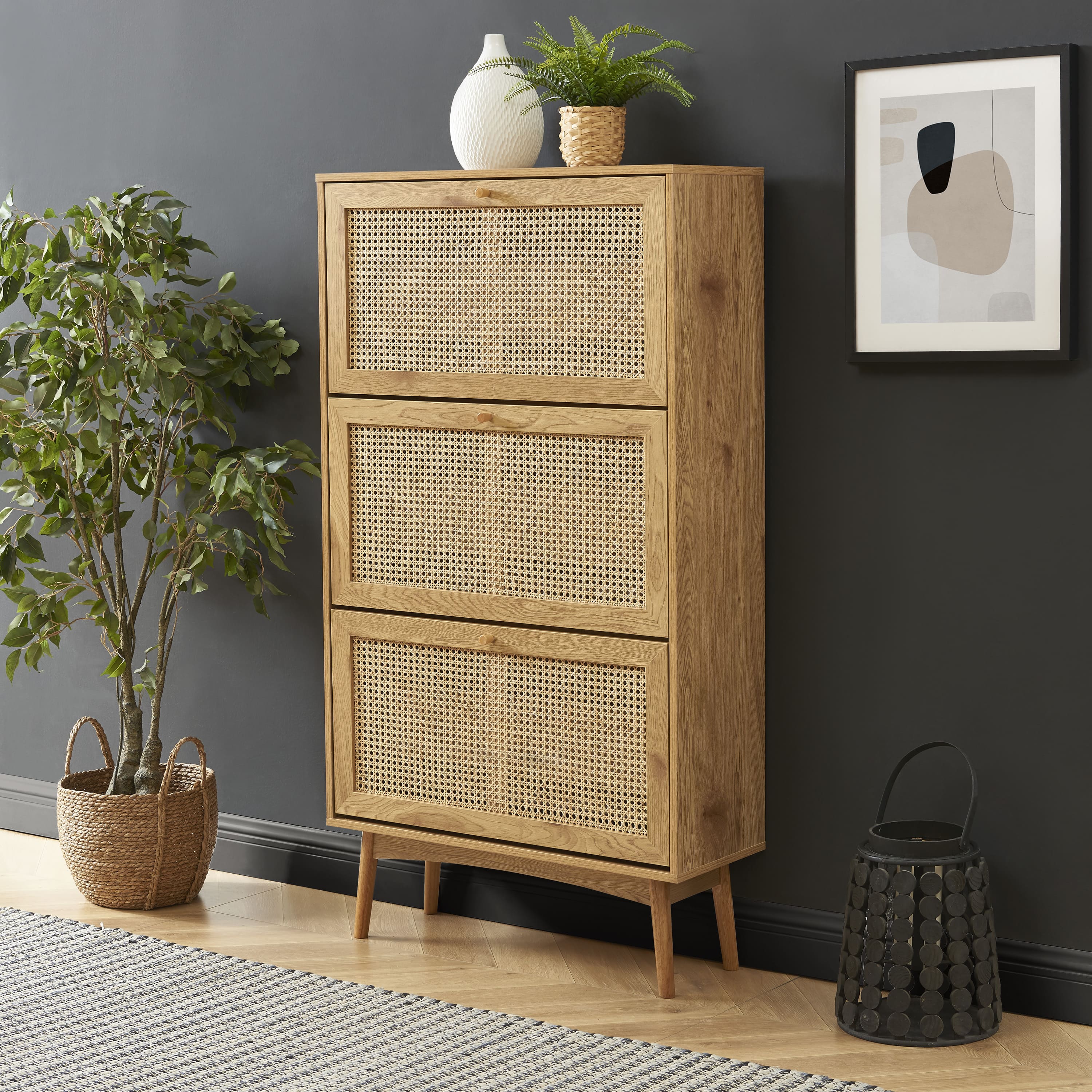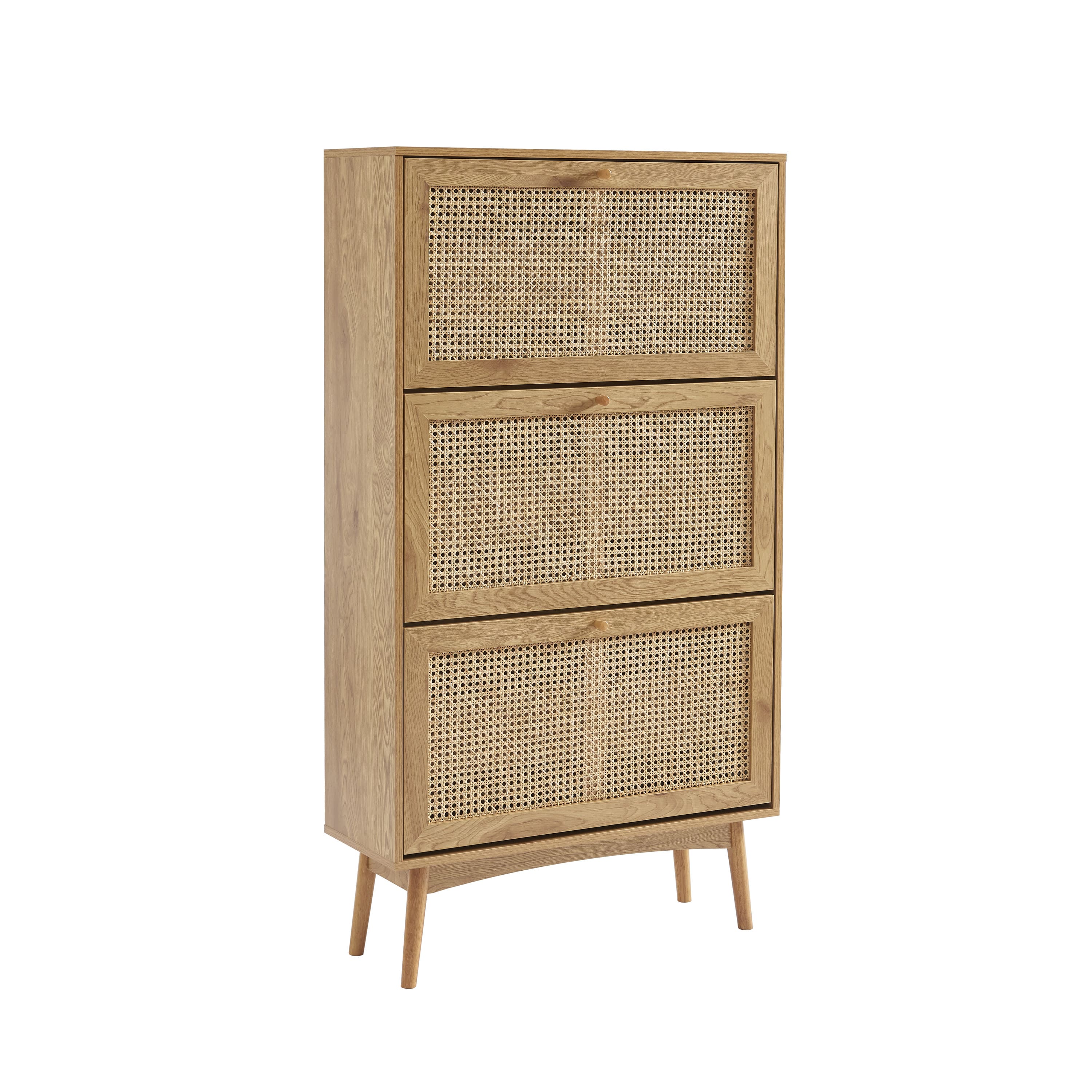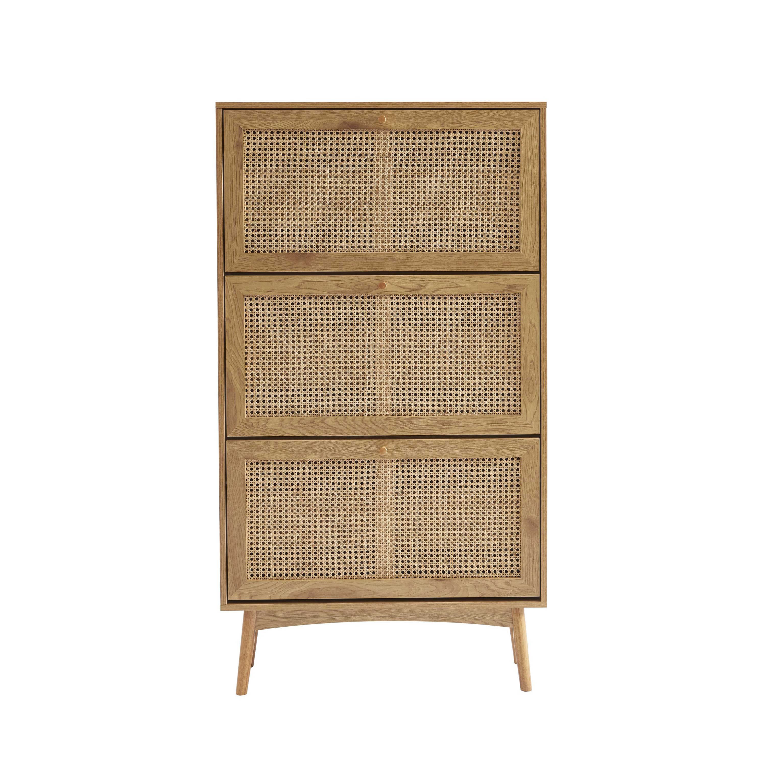 On tombe littéralement sous le charme de ces 3 portes à battants habillées de cannage en rotin circulaire. De plus, son revêtement effet chêne clair et ses poignées en bois massif apportent à ce meuble à chaussures un vrai caractère.