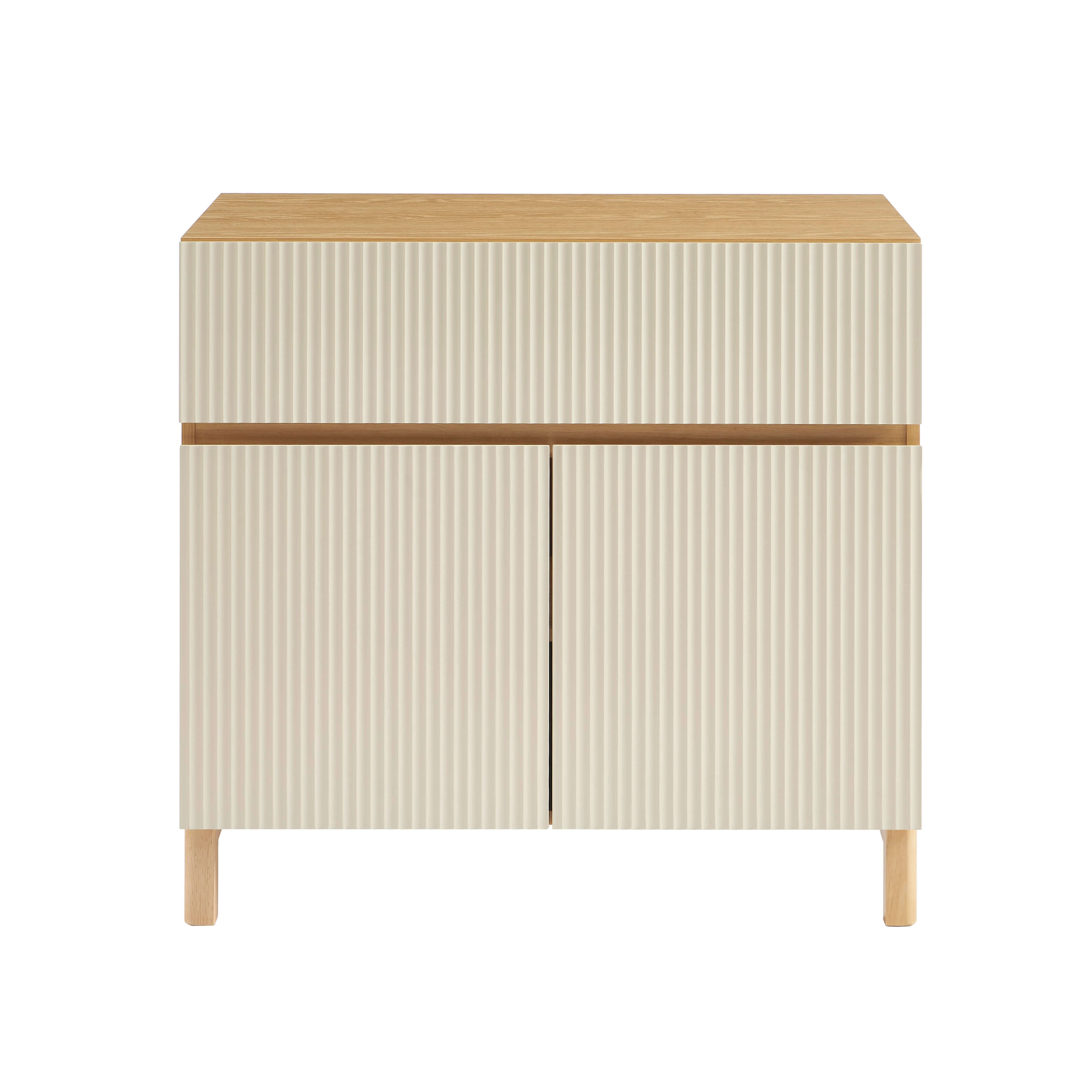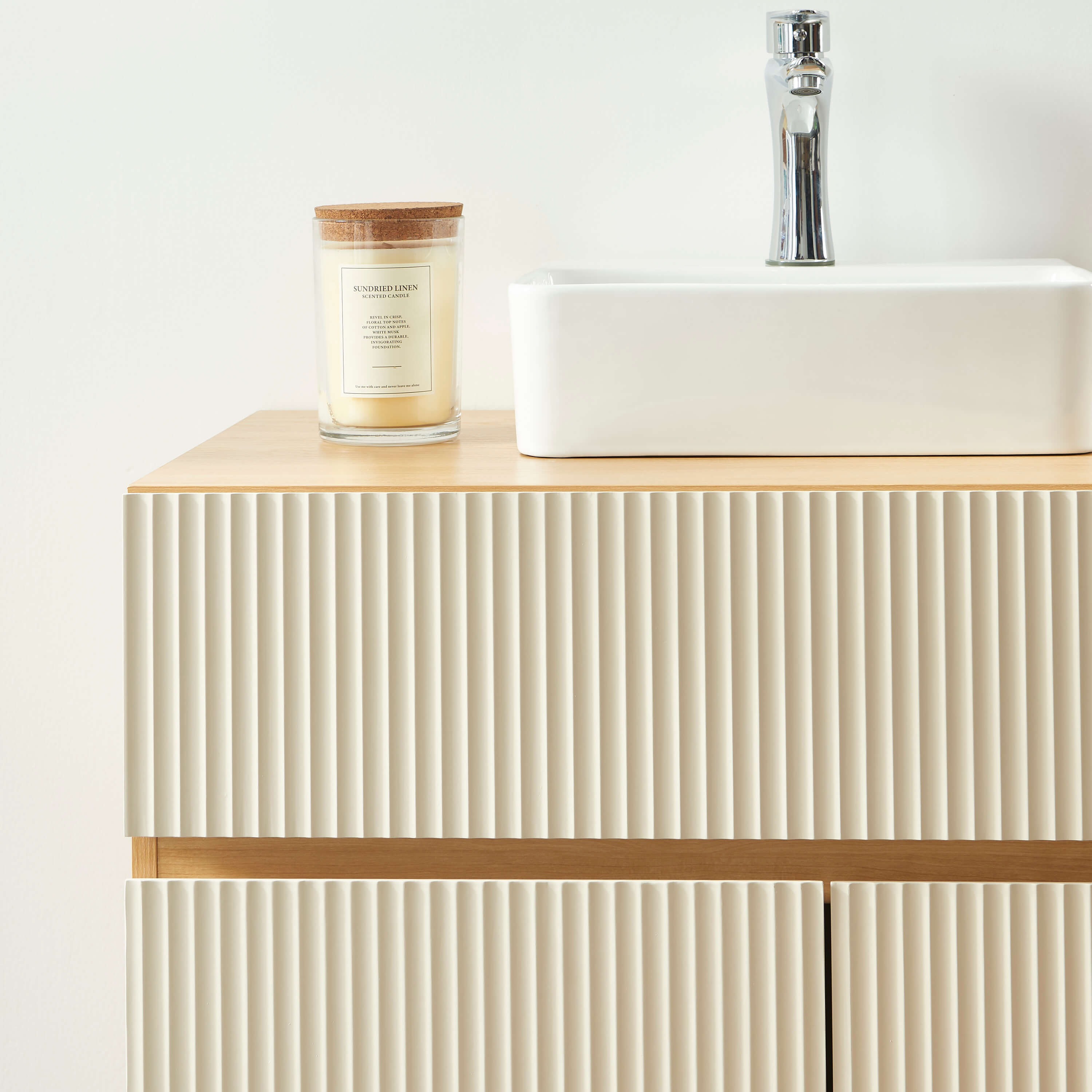 Design et fonctionnel, le meuble sous vasque ORCA associe un effet chêne chaleureux avec des portes beiges cannelées pour un style moderne et des rangements optimisés.