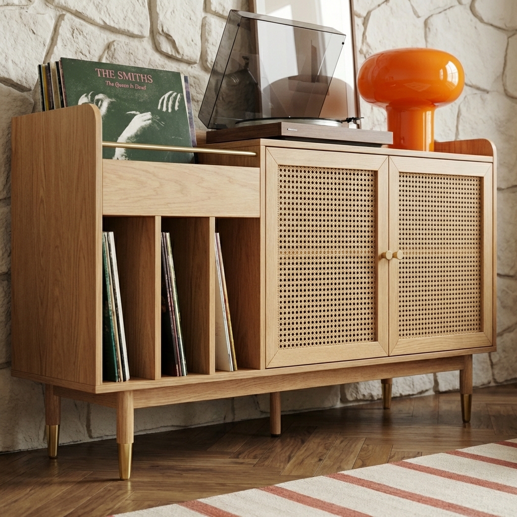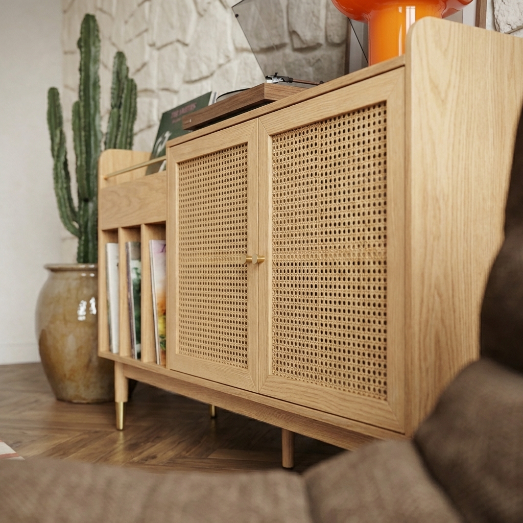 On tombe également sous le charme de ces détails en laiton doré, donnant une touche chic à ce meuble vinyle en cannage et chêne massif.