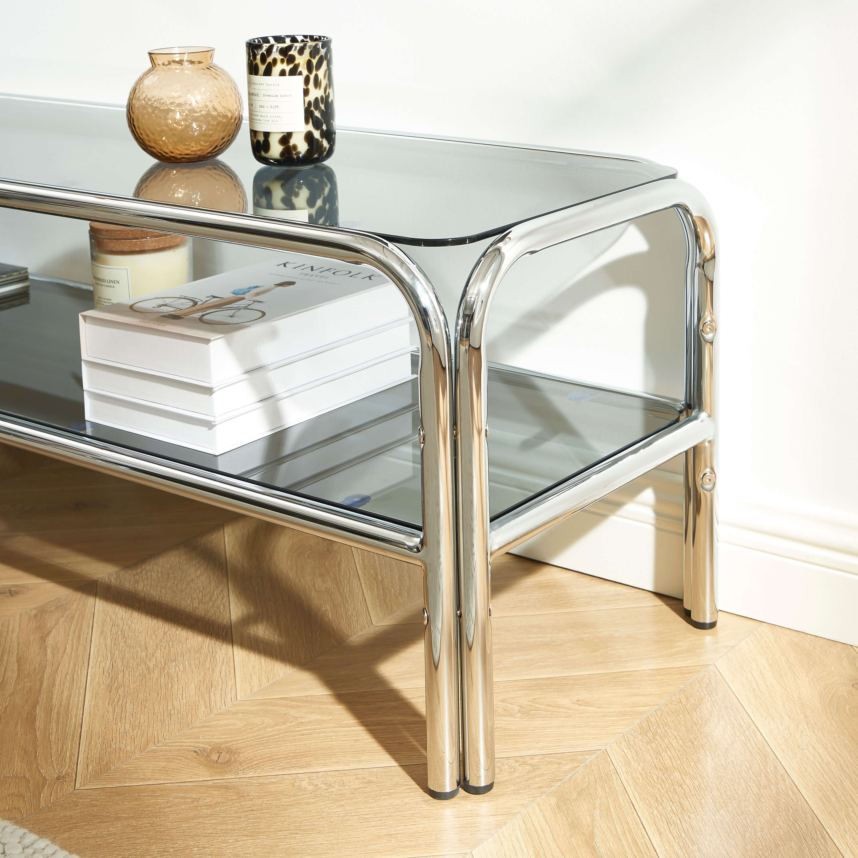 Avec son plateau en verre trempé et sa structure en chrome, le meuble TV MAGGY séduit par son style moderne. Ses lignes arrondies et sa finition brillante apporteront une touche d’élégance à votre salon, tout en s’harmonisant facilement avec un intérieur contemporain ou minimaliste.
