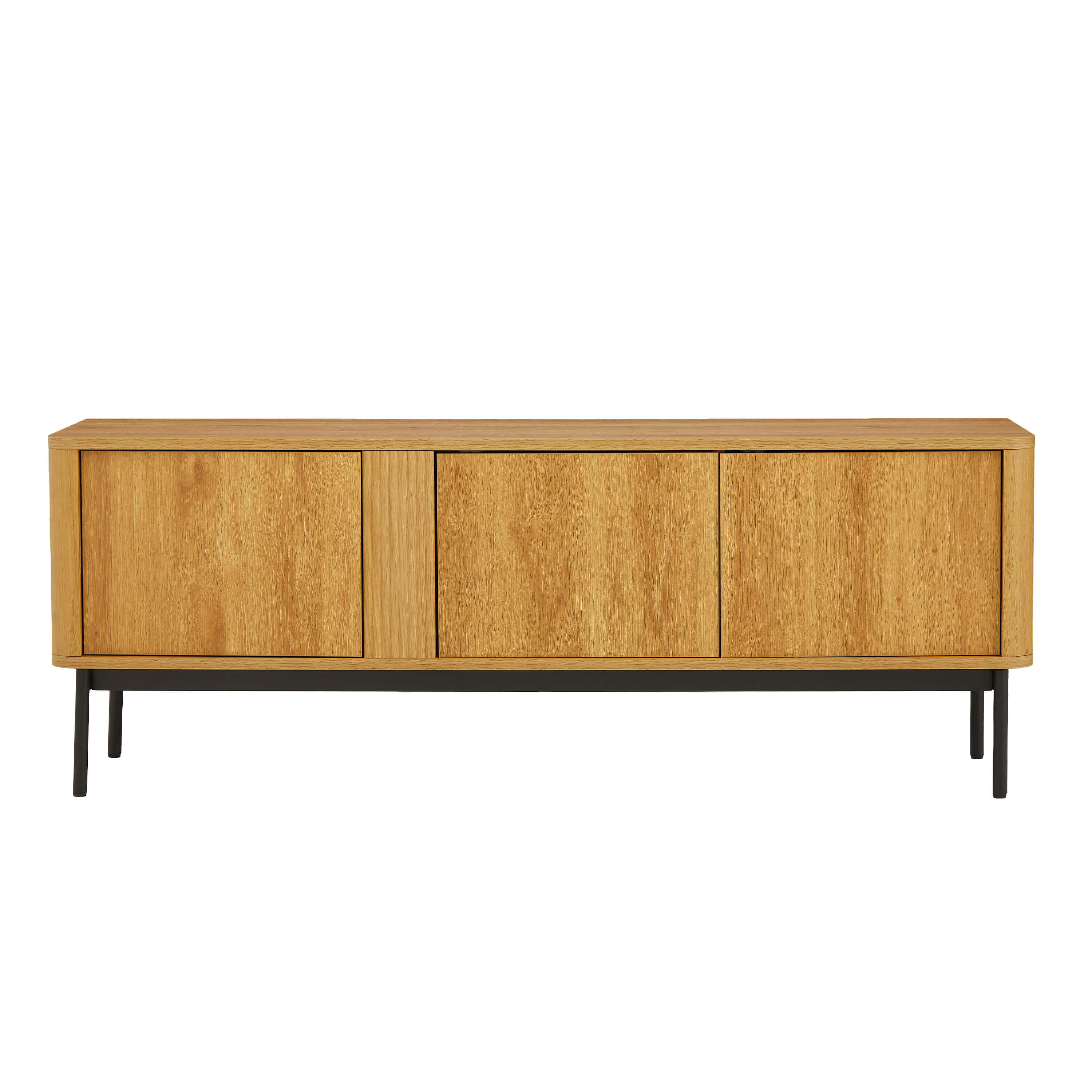 Un meuble TV élégant et pratique, associant un revêtement effet chêne chaleureux à un piètement en acier noir au style contemporain.