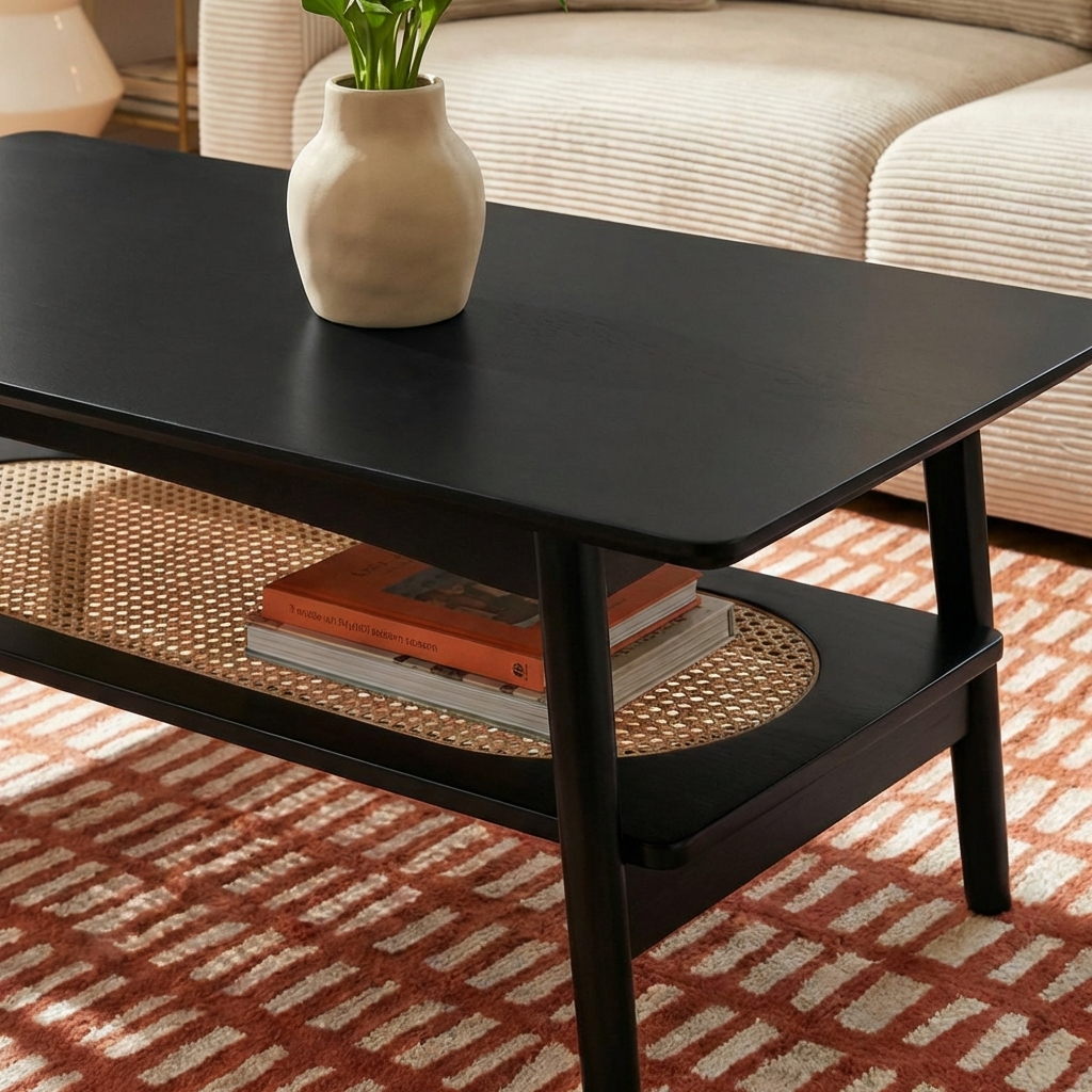 Table basse ANATOLE couleur noir avec cannage en rotin - dimension : 115 x 60 x 40 cm