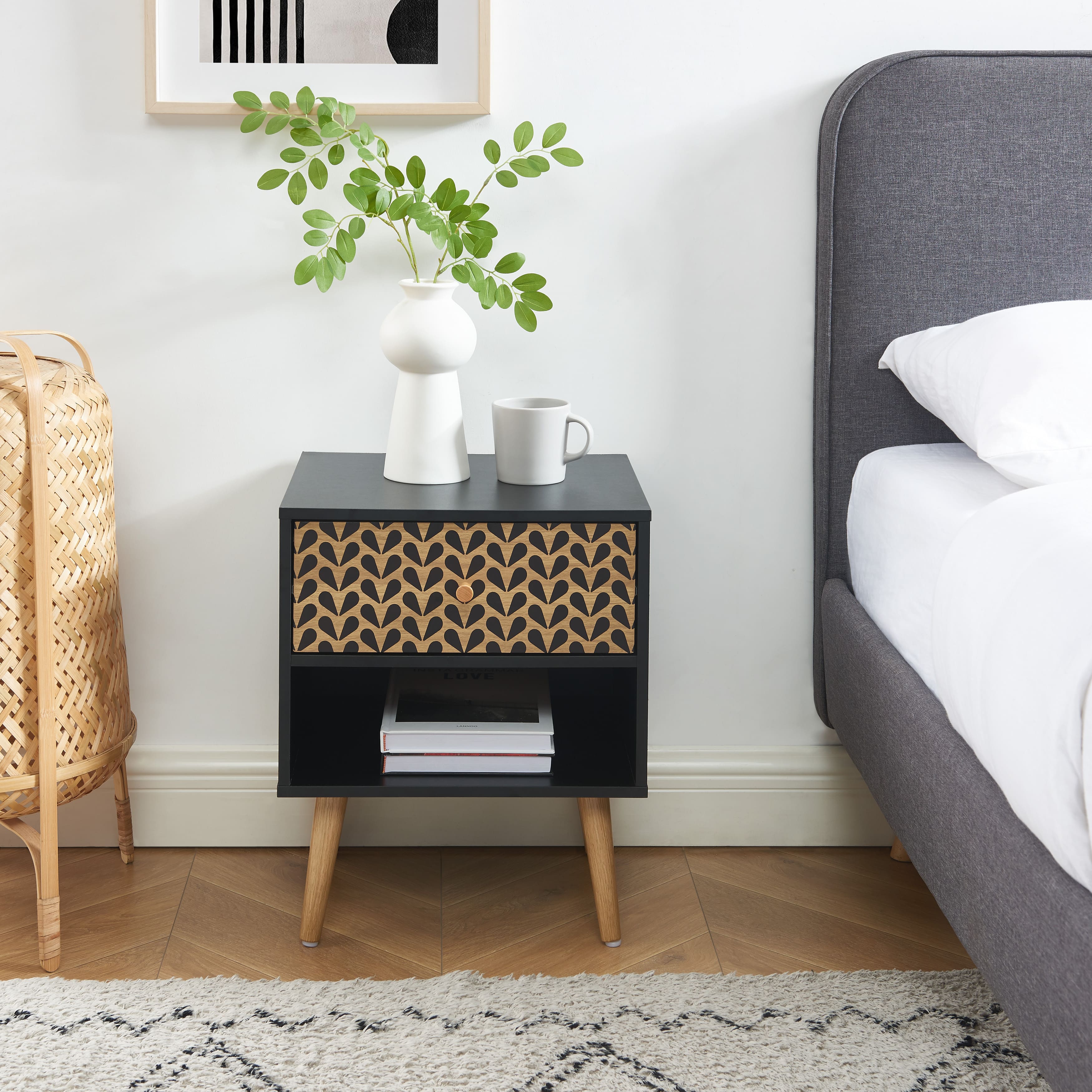 Doté d'un tiroir à motifs et d'une niche, le chevet CAPUCINE vous permet de ranger vos livres, vos magazines, vos lunettes de nuit et vos autres effets personnels en toute simplicité. Le tiroir coulisse facilement grâce à ses rails métalliques, tandis que la niche vous offre un espace supplémentaire pour exposer vos objets décoratifs préférés.