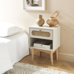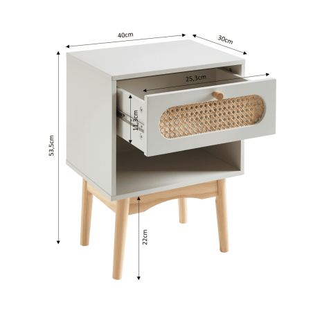 Table de chevet SIXTINE couleur gris perle avec cannage en rotin - dimensions : 40 x 30 x 53,5 cm
