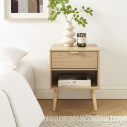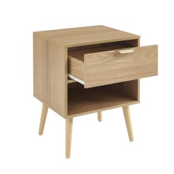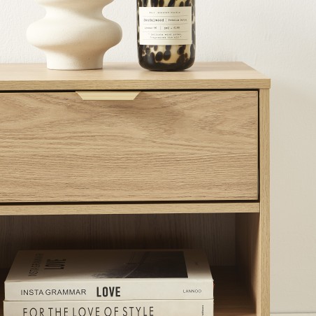 Chaque table de chevet est équipée d'un tiroir spacieux pour ranger vos petits objets et d'une niche ouverte, idéale pour garder vos livres ou appareils à portée de main. La poignée en métal doré ajoute une note chic et rétro à l'ensemble.