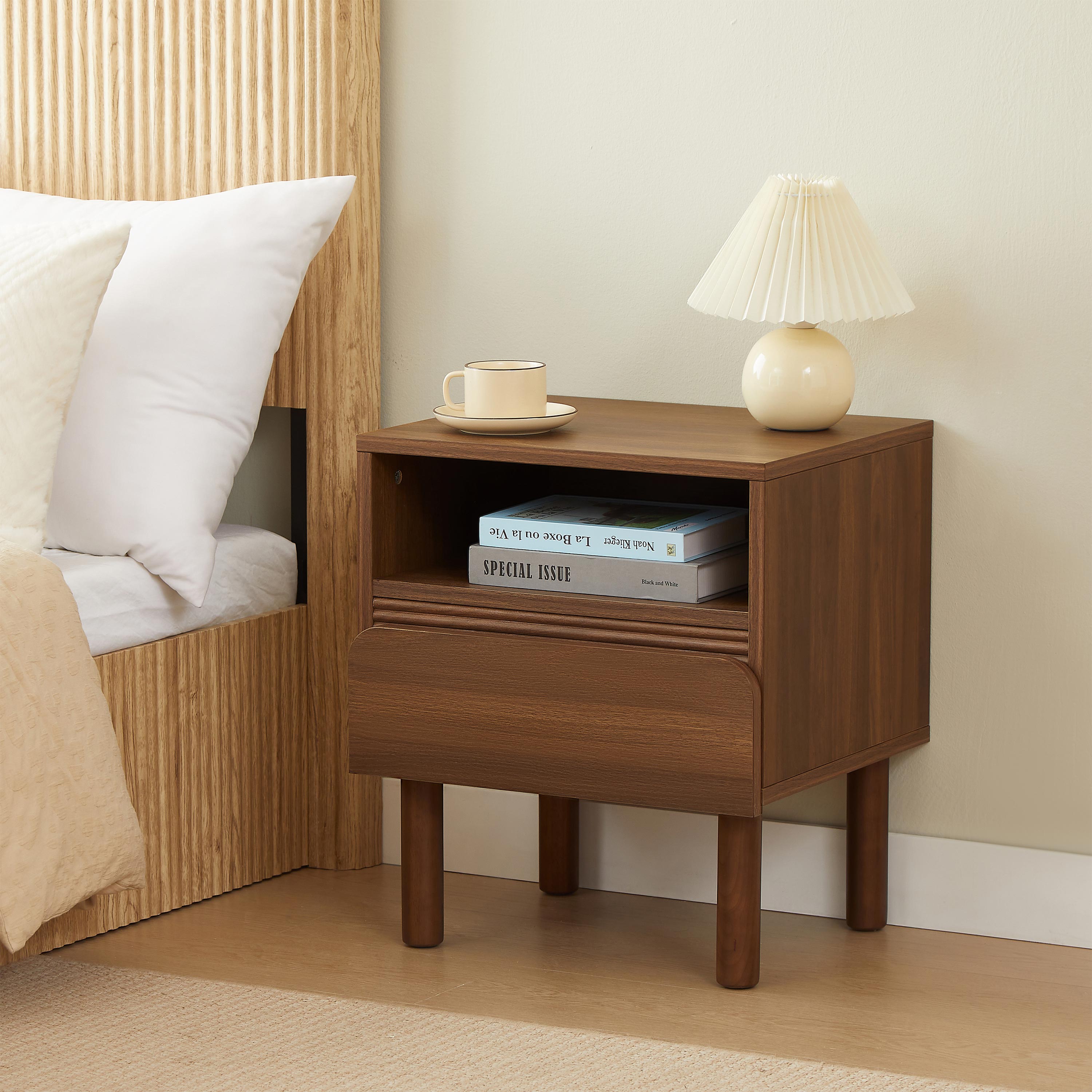 La table de chevet ORO séduit par son design simple et chaleureux. Son revêtement effet noyer apporte une touche naturelle qui s'accorde facilement avec tous types de chambres, qu'elles soient modernes, scandinaves ou classiques.