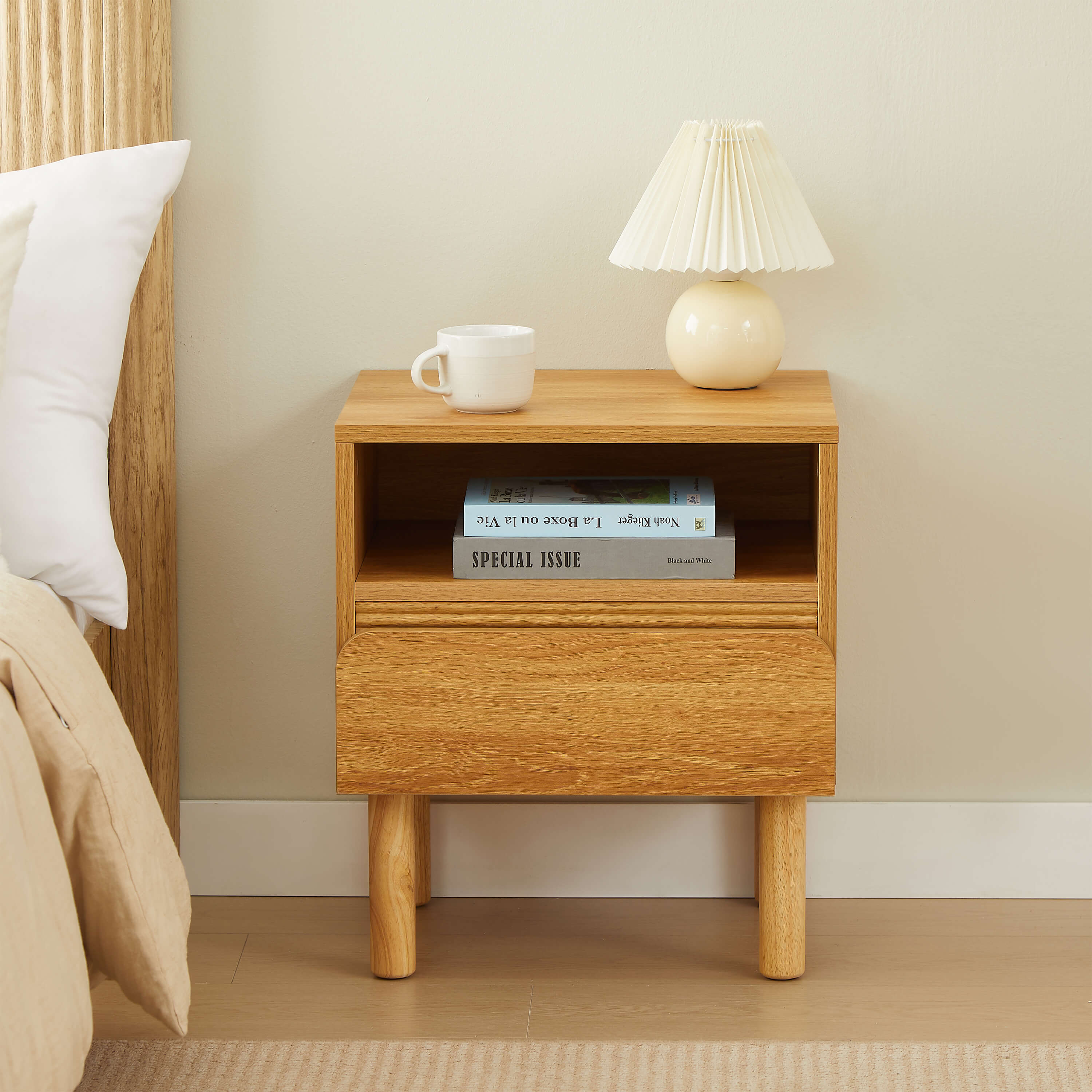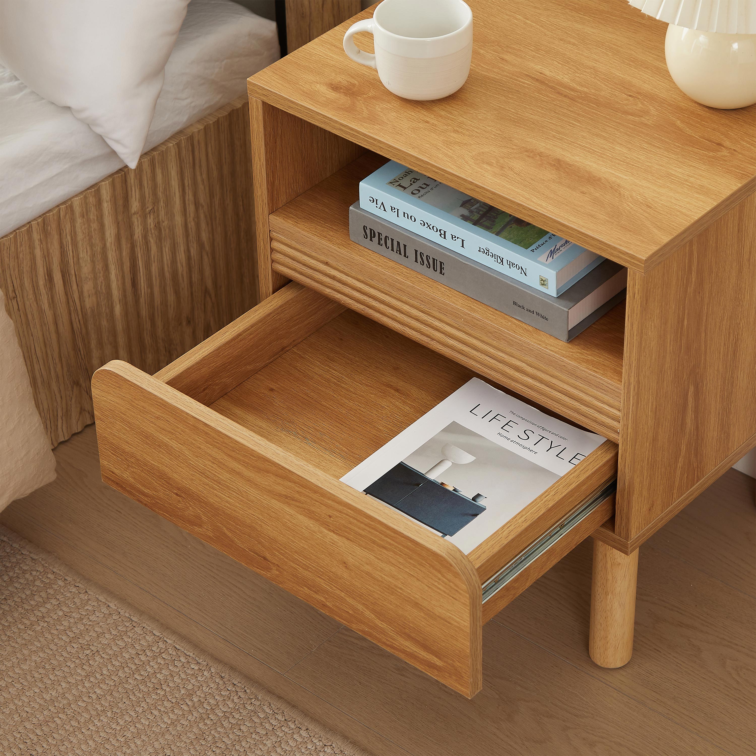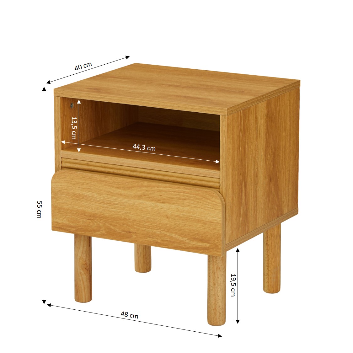 La table de chevet ORO séduit par son design simple et chaleureux. Son revêtement effet chêne apporte une touche naturelle qui s'accorde facilement avec tous types de chambres, qu'elles soient modernes, scandinaves ou classiques.