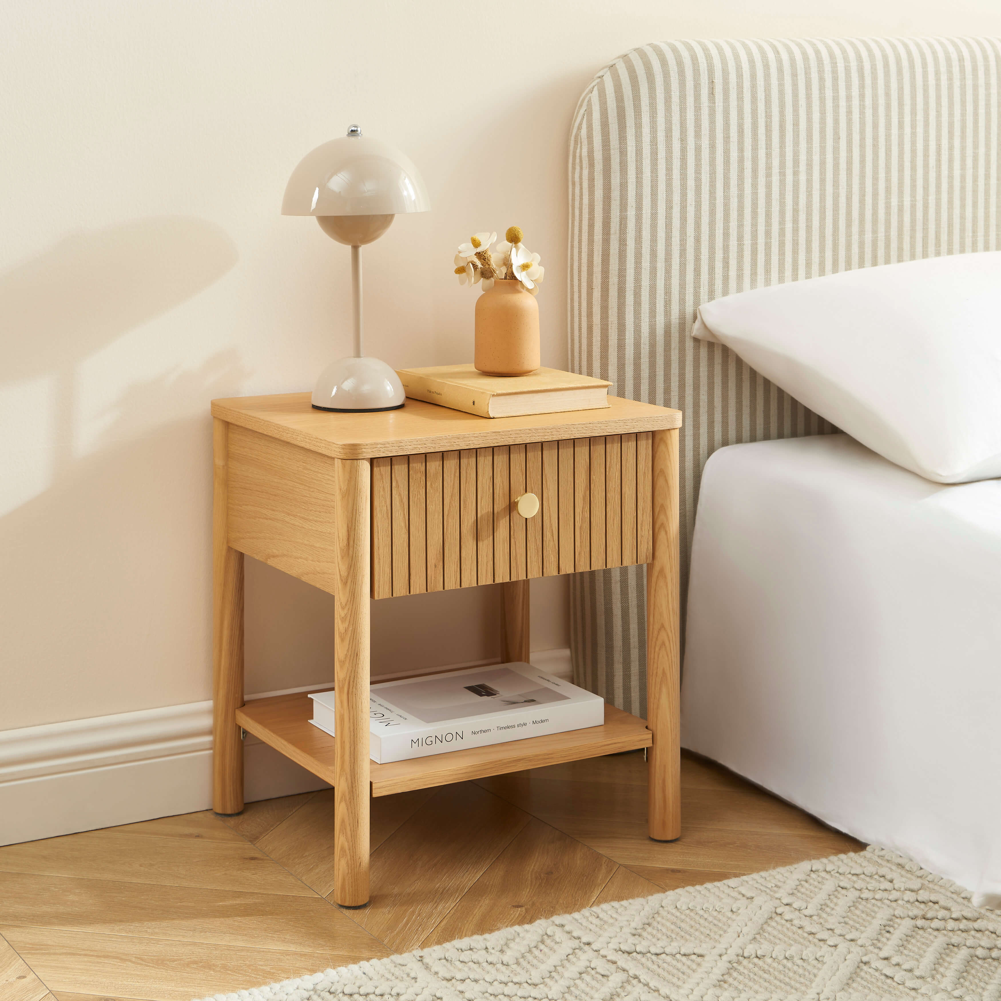 La table de chevet CLEO en placage chêne séduit par son tiroir cannelé, ses pieds en frêne massif et sa poignée dorée élégante. Compacte et raffinée, elle allie fonctionnalité et style naturel.
