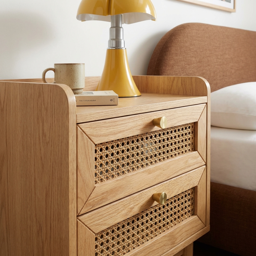 La table de chevet LEON en placage chêne et cannage est un meuble compact et raffiné qui combinera rangement et style naturel dans votre chambre.