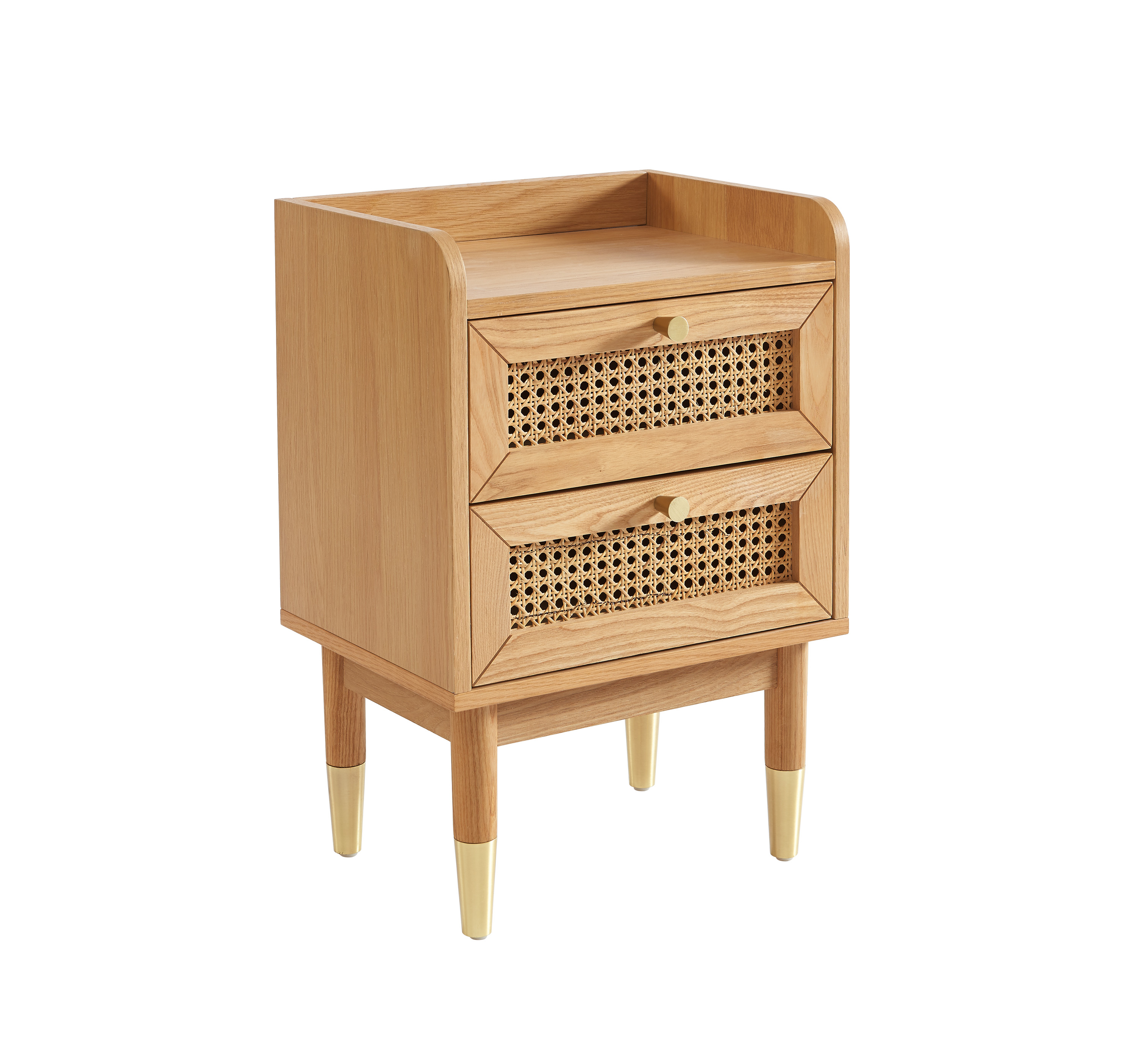Les deux tiroirs de la table de chevet LEON ajoutent à la fois du style et de la fonctionnalité au meuble. Leur façade en cannage rotin apporte une touche de texture et naturel, tout en rappelant l’inspiration rétro, renforcée par les poignées cylindriques en laiton doré.