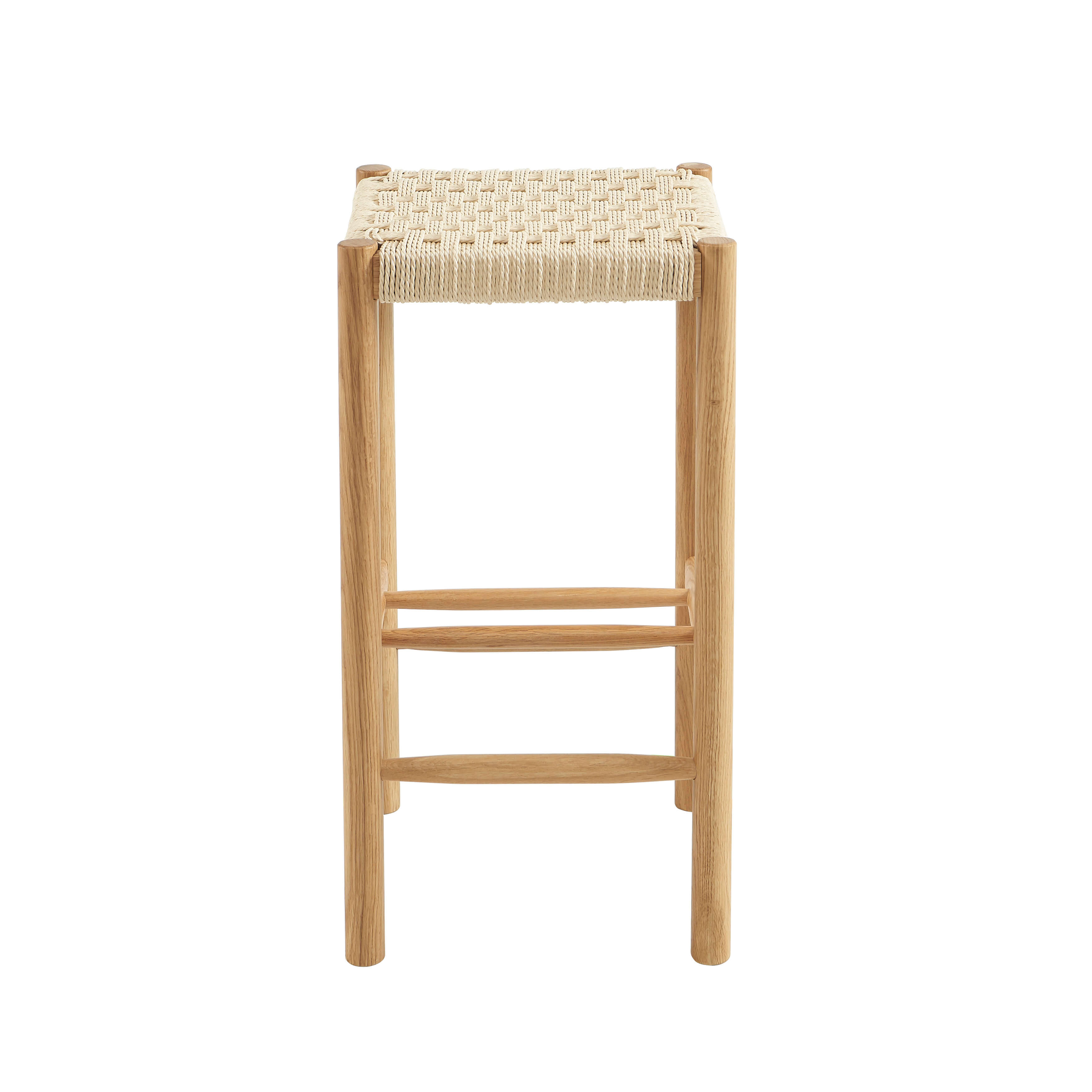 Le lot de 2 tabourets ELLIO associe la chaleur du chêne massif à une assise en corde pour un style naturel et authentique, idéal autour d’un îlot ou d’un bar.