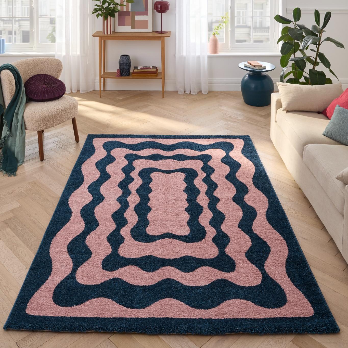 Avec ses formes ondulées et son motif graphique, le tapis ABBY bleu apporte une touche rétro et audacieuse à votre intérieur.