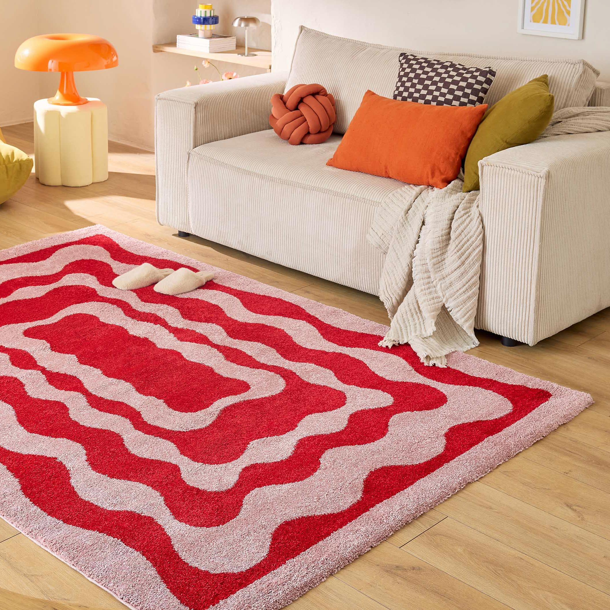 Apportez une touche rétro et chaleureuse à votre intérieur avec le tapis ABBY rouge au motif vintage, alliant style et confort.
