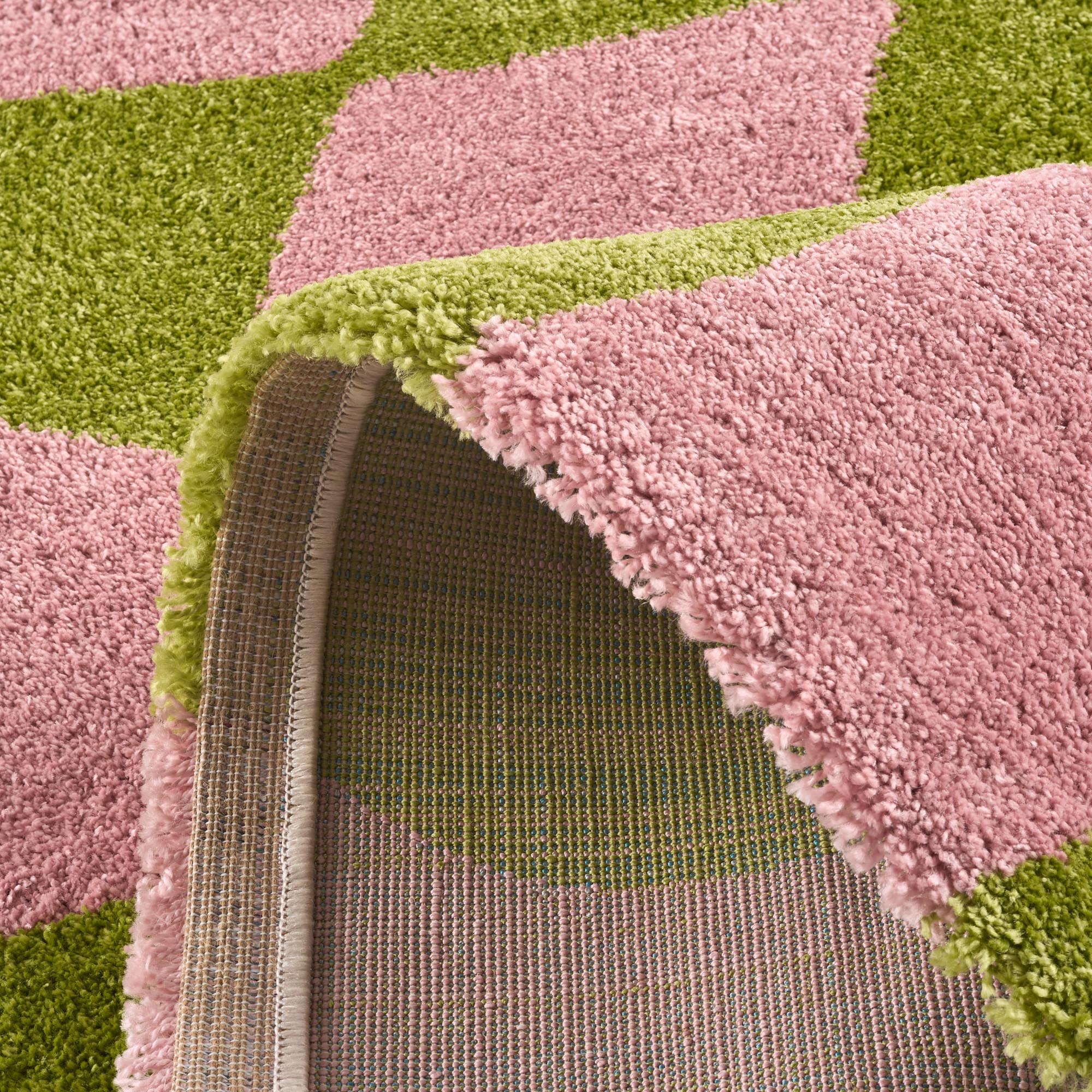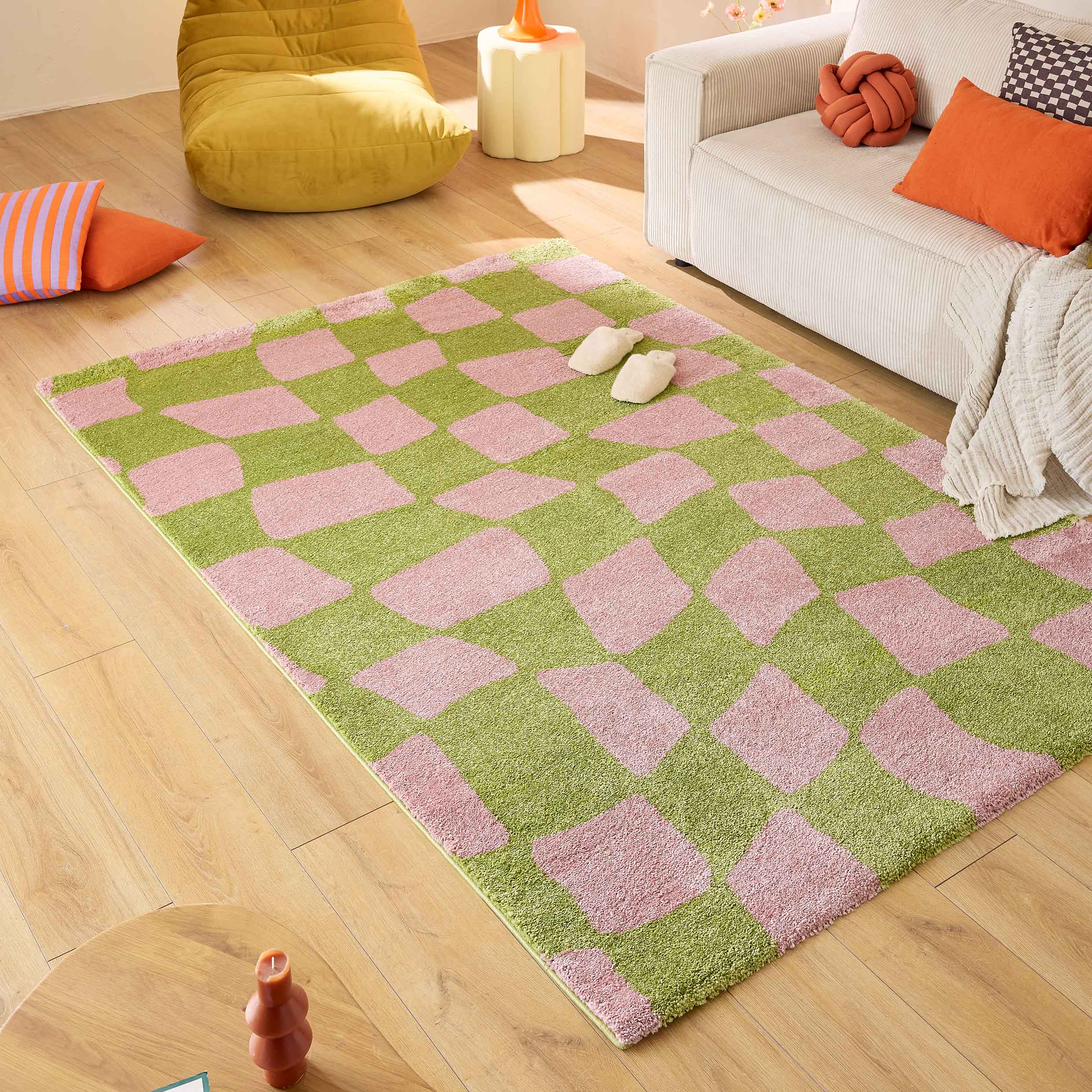 Apportez modernité et style rétro à votre intérieur avec le tapis ABBY vert au motif damier asymétrique.