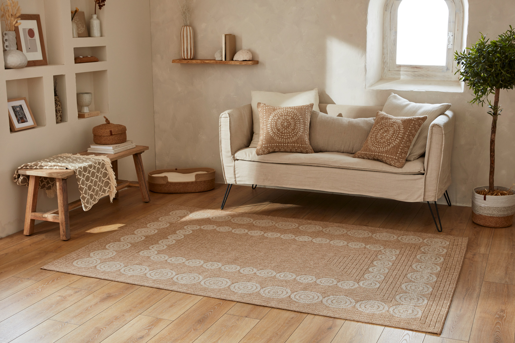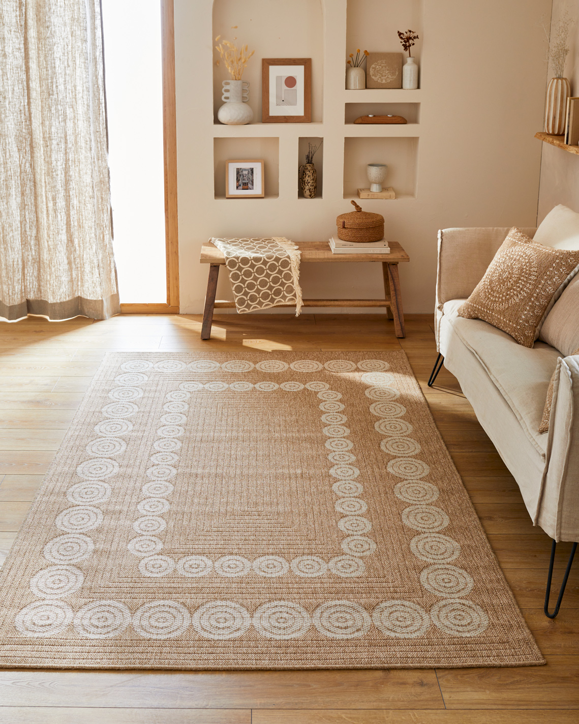 Découvrez notre magnifique tapis MALLORCA marron et blanc aspect jute de la collection BEAU RIVAGE®. Ce tapis est conçu pour une utilisation aussi bien en extérieur qu'en intérieur, offrant une touche d'élégance et de fraîcheur à n'importe quel espace.