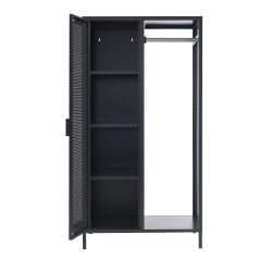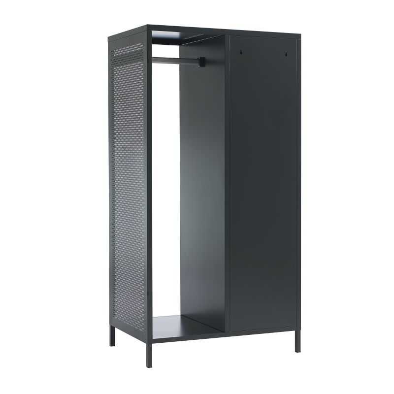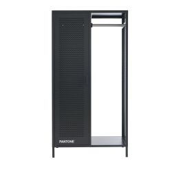 La conception intelligente du vestiaire PANTONE offre un espace de rangement organisé et multifonctionnel. La partie gauche du meuble est équipée de trois étagères en métal, dissimulées derrière une porte en métal perforé.
